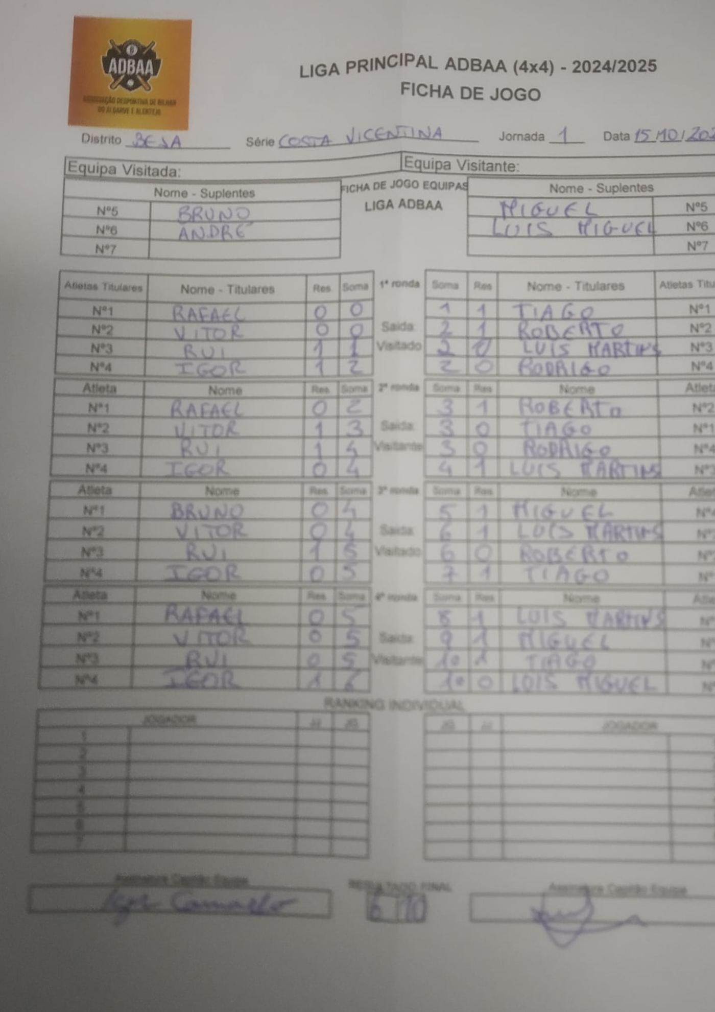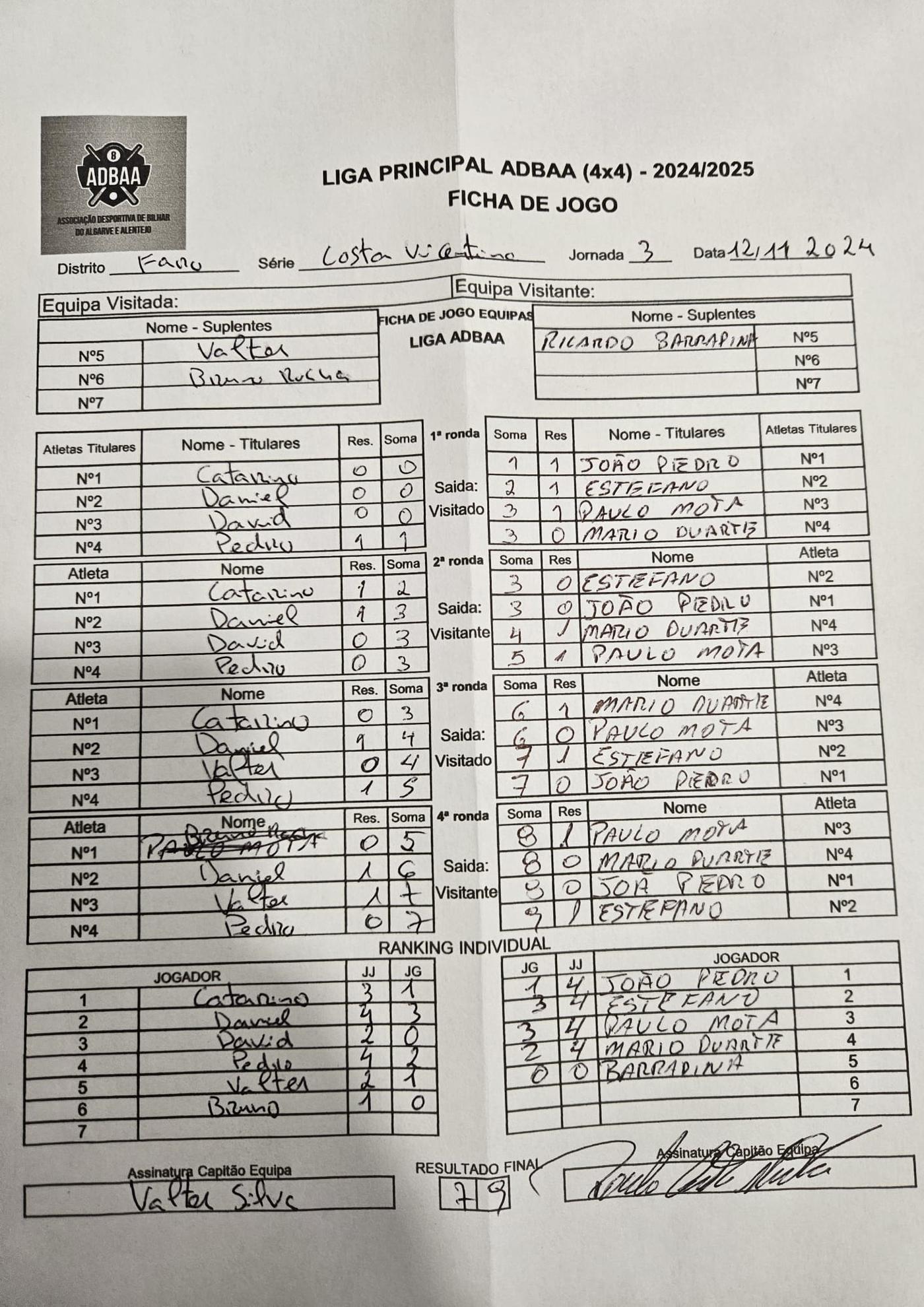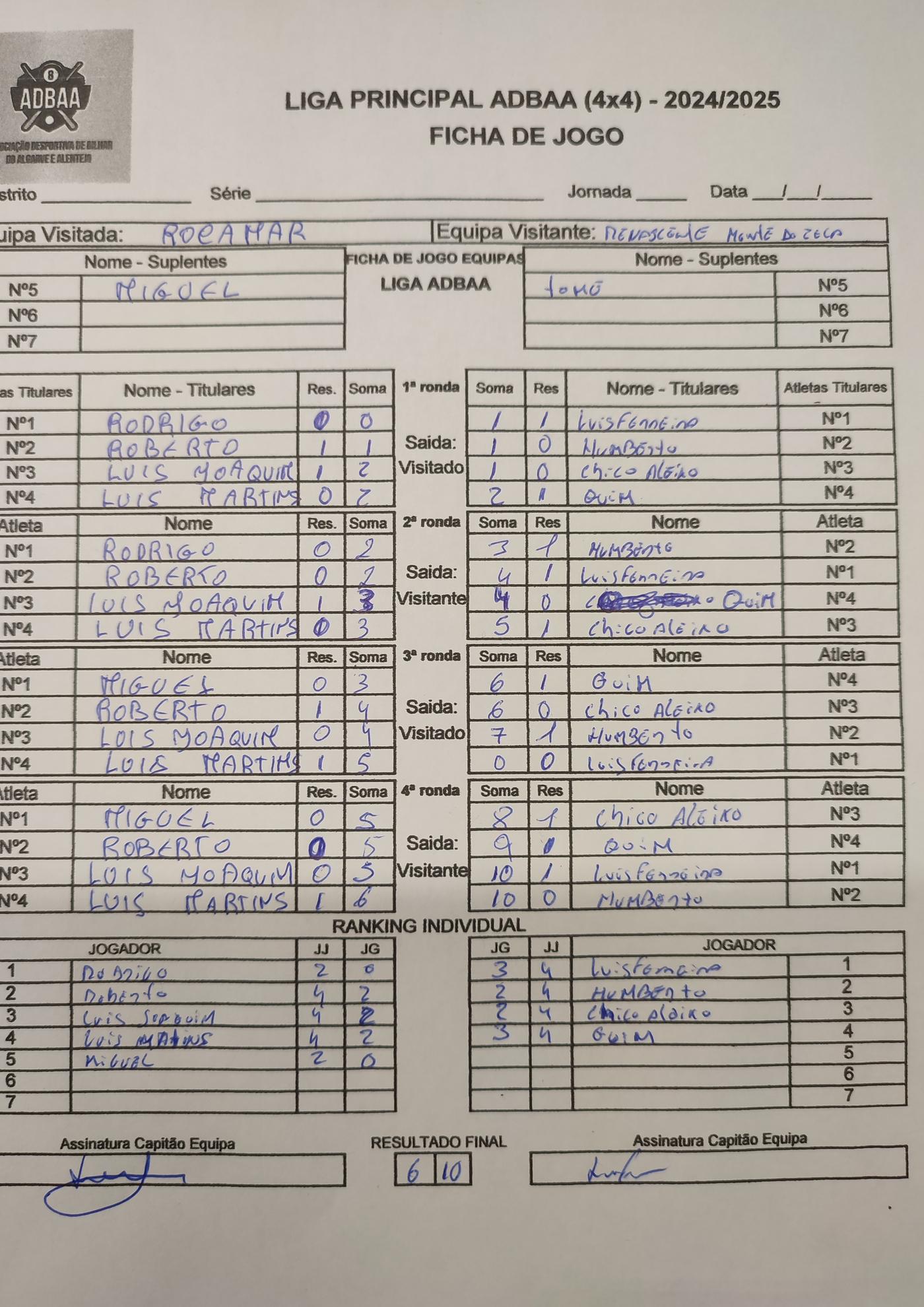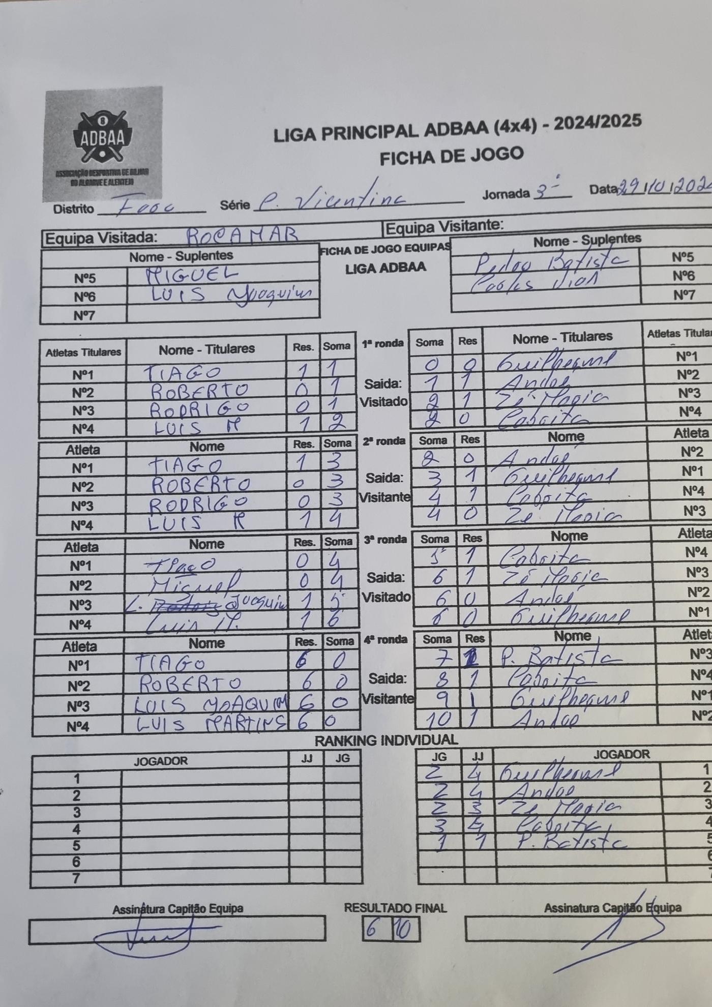 3 | 15 | RESTAURANTE ROCAMAR | 6-10 | JC ALJEZURENSE REGRAS E ENSAIOS | 29/10/2024 | <Sem observações>