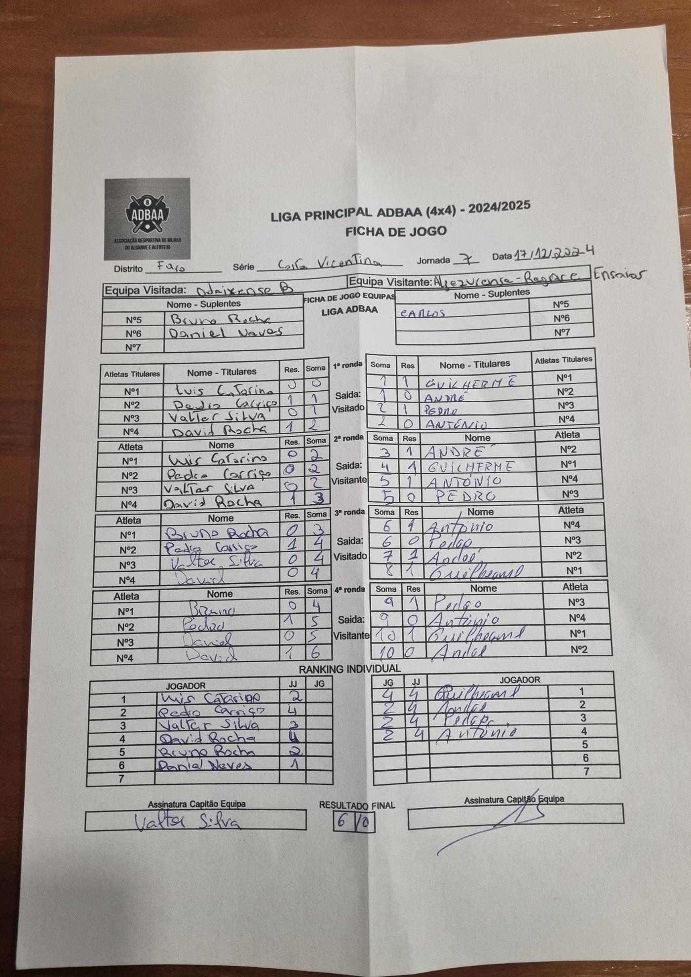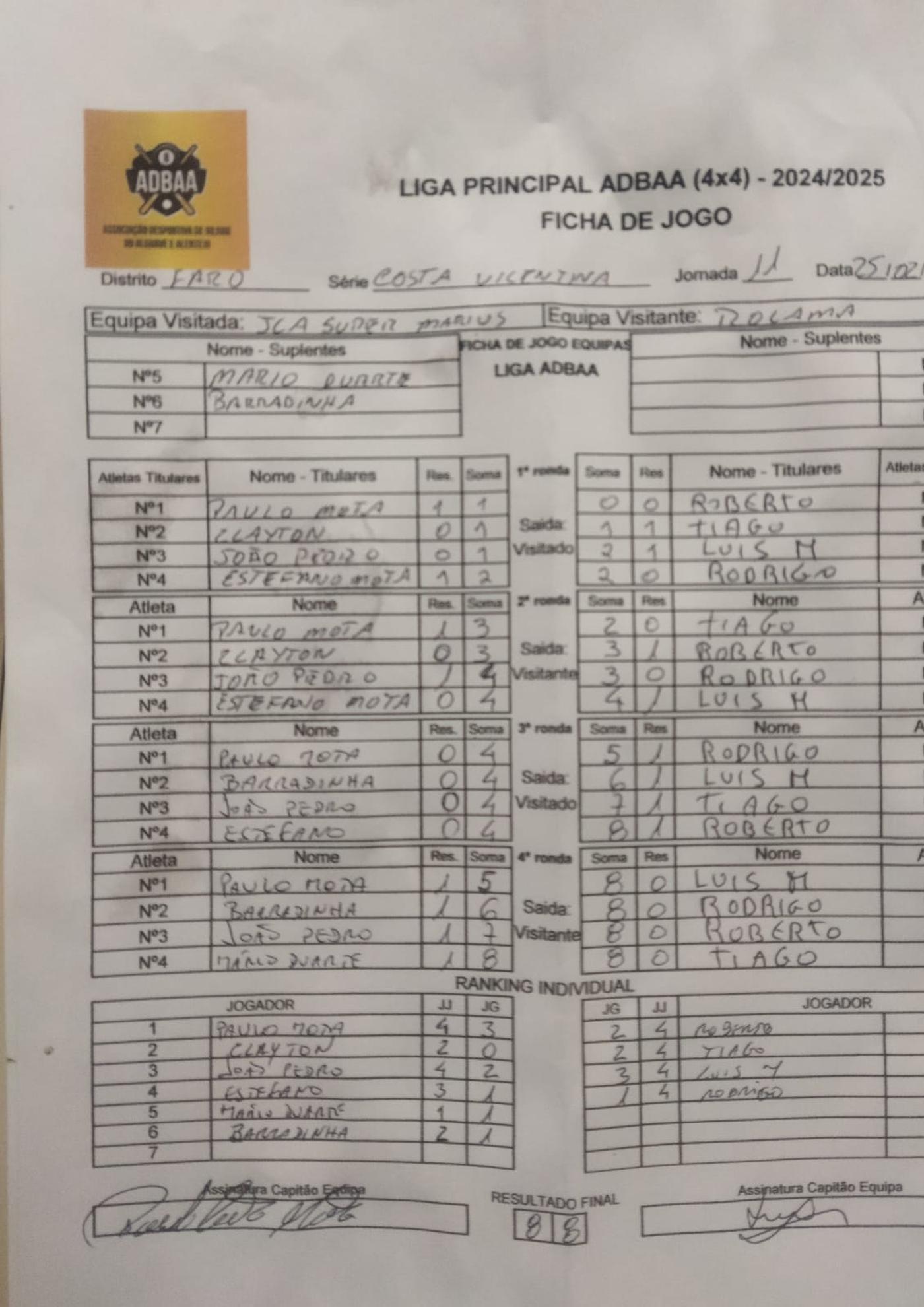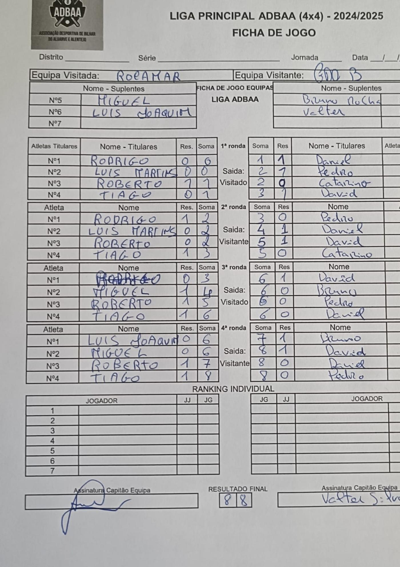 3 | 15 | RESTAURANTE ROCAMAR | 6-10 | JC ALJEZURENSE REGRAS E ENSAIOS | 29/10/2024 | <Sem observações>