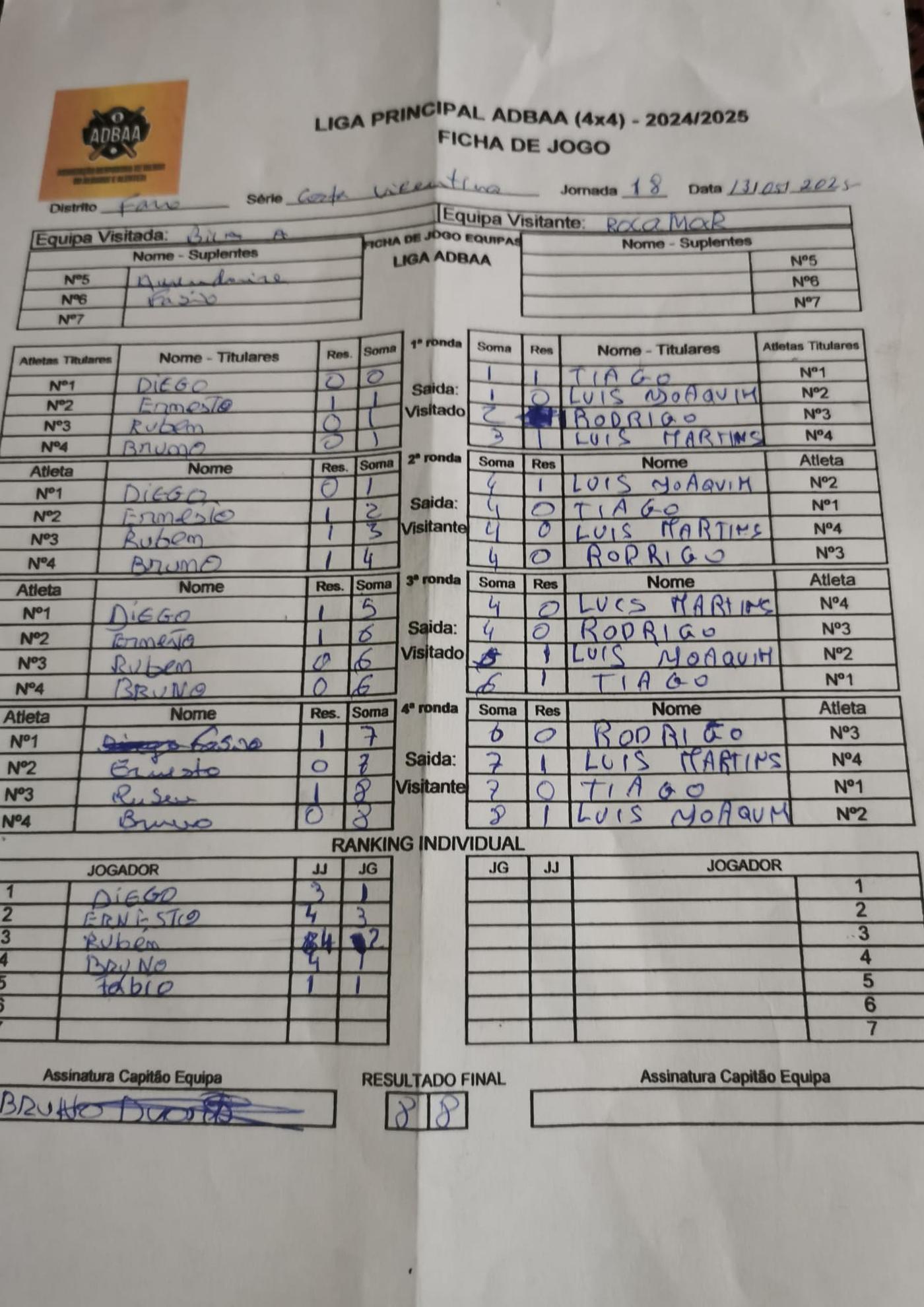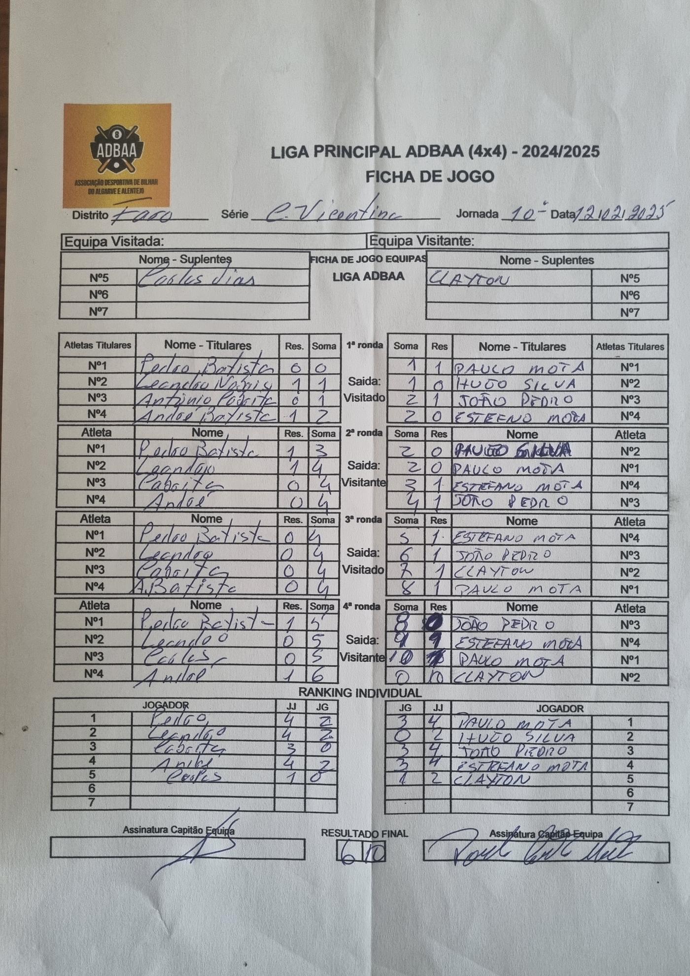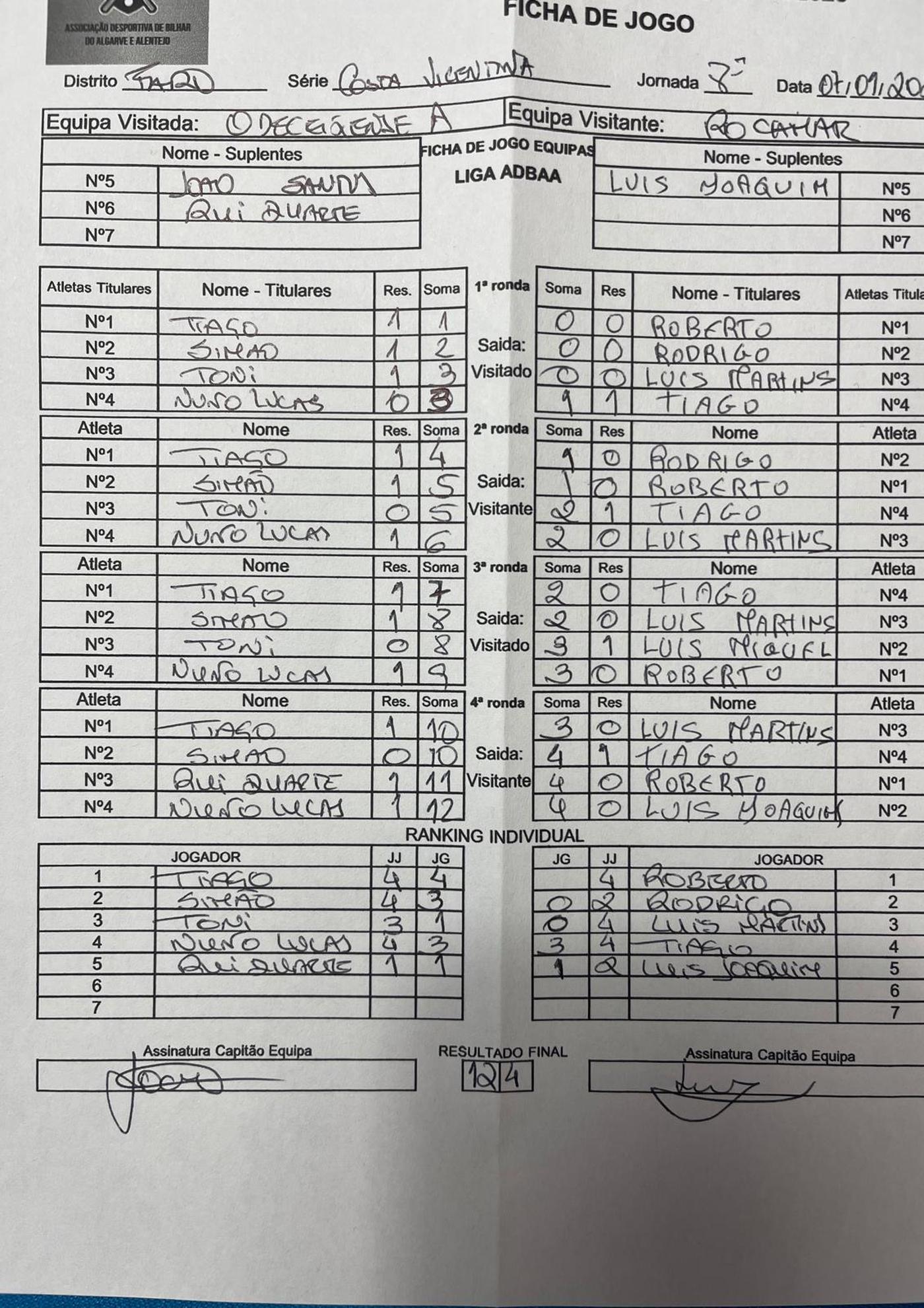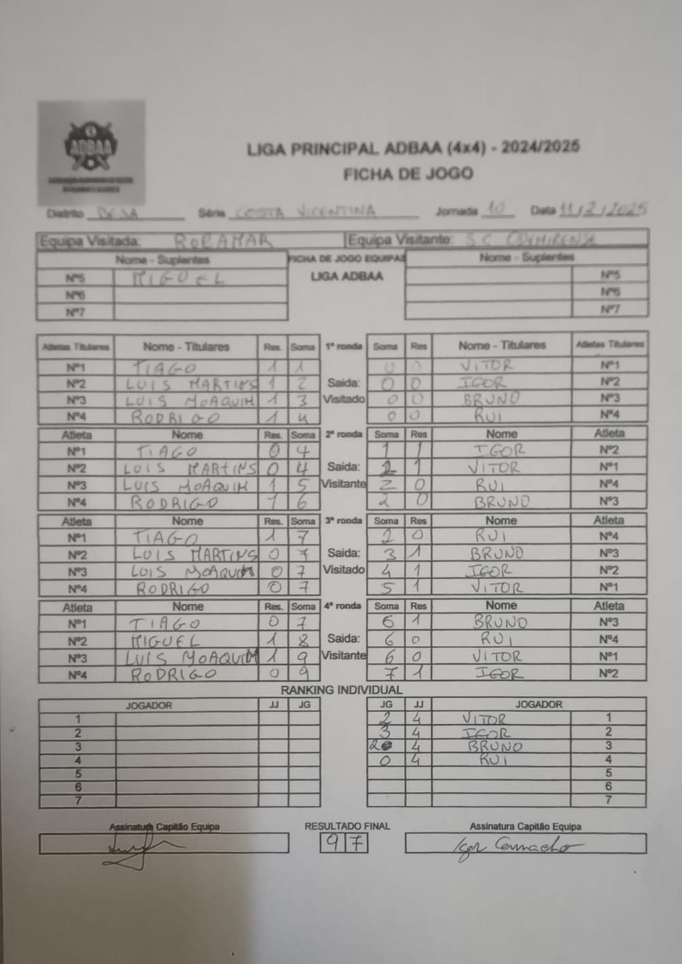 3 | 15 | RESTAURANTE ROCAMAR | 6-10 | JC ALJEZURENSE REGRAS E ENSAIOS | 29/10/2024 | <Sem observações>