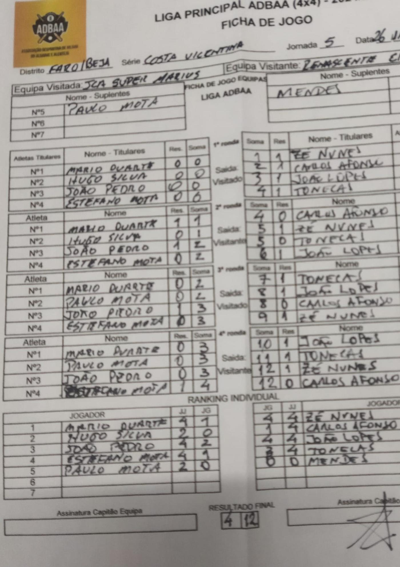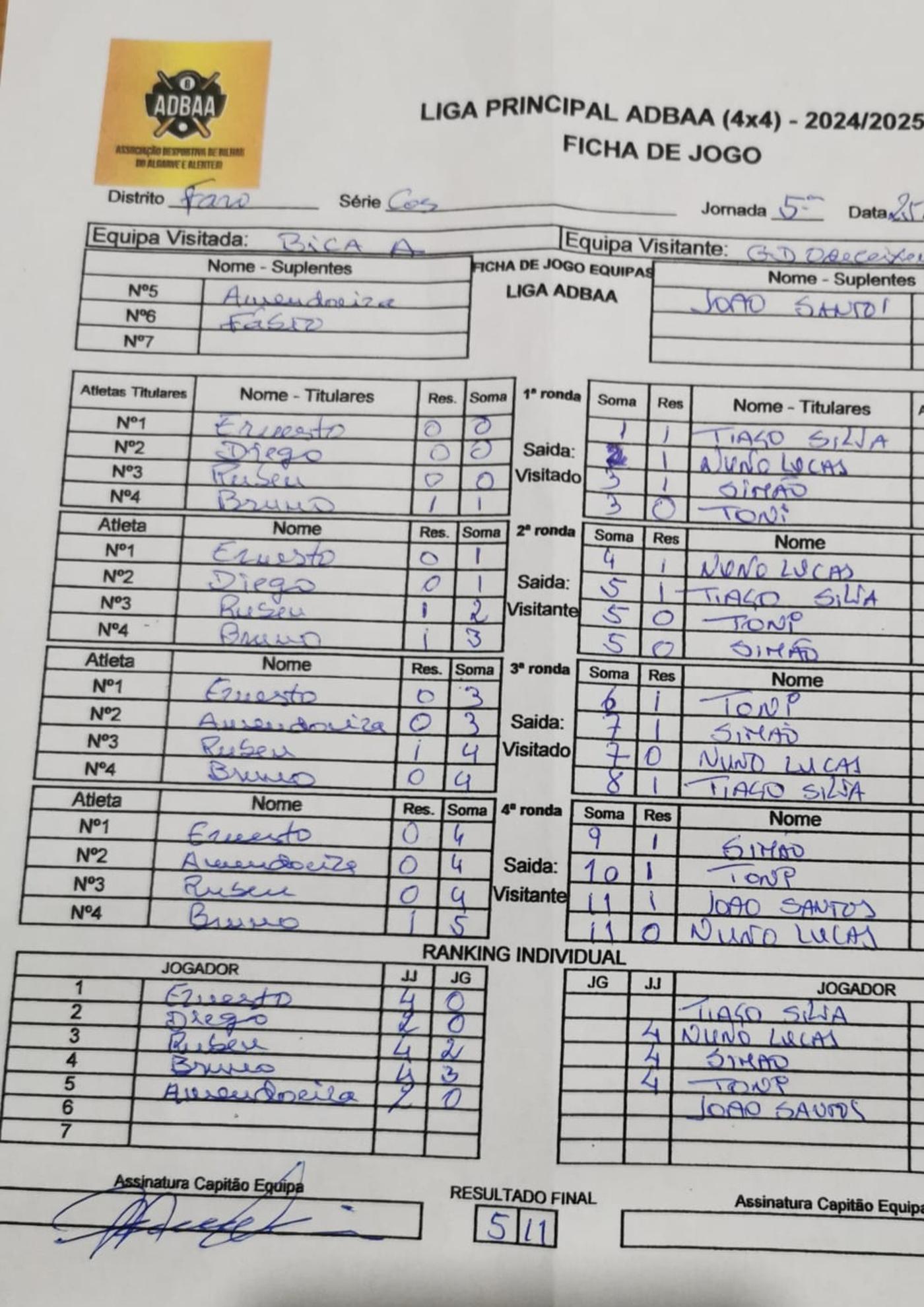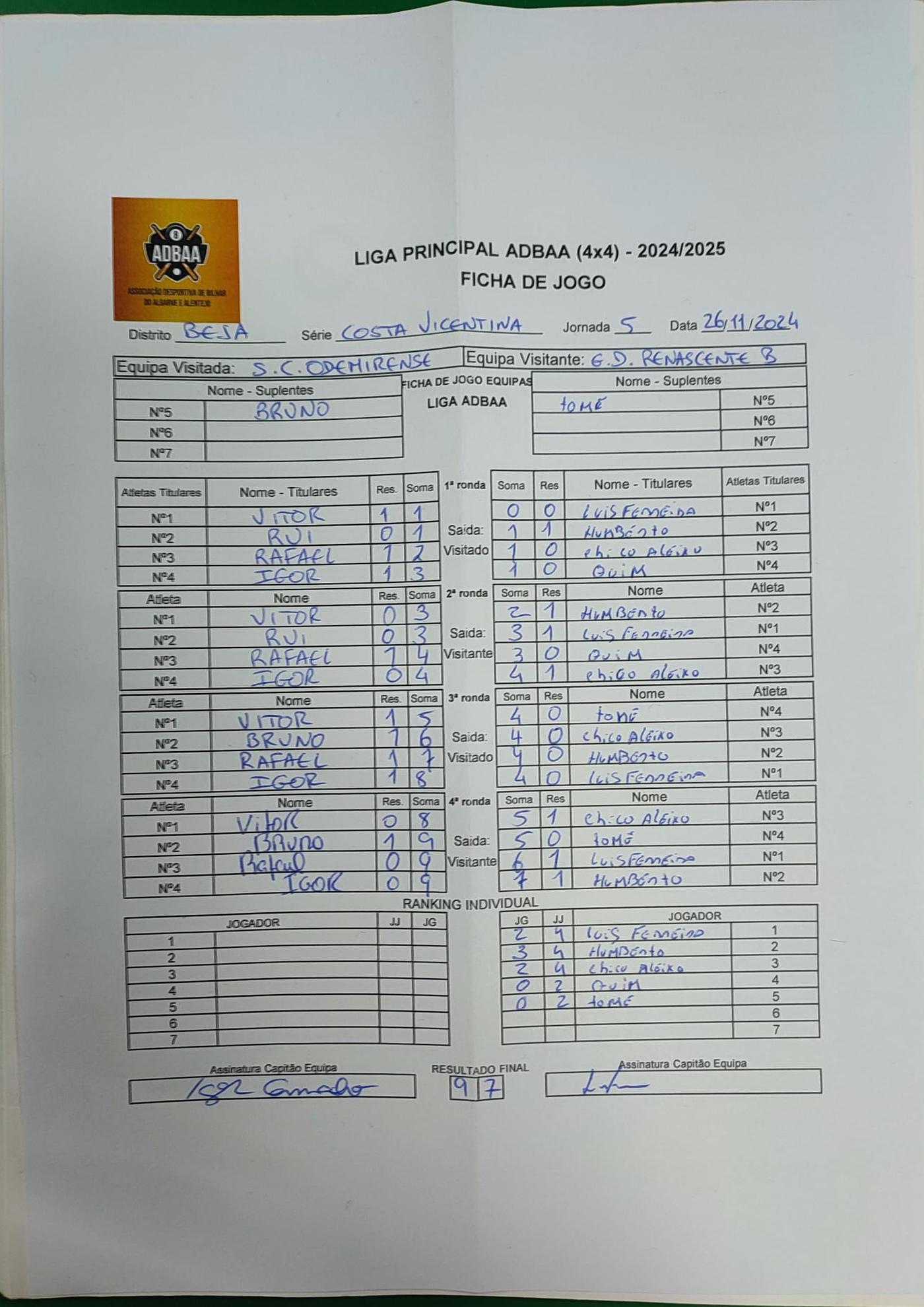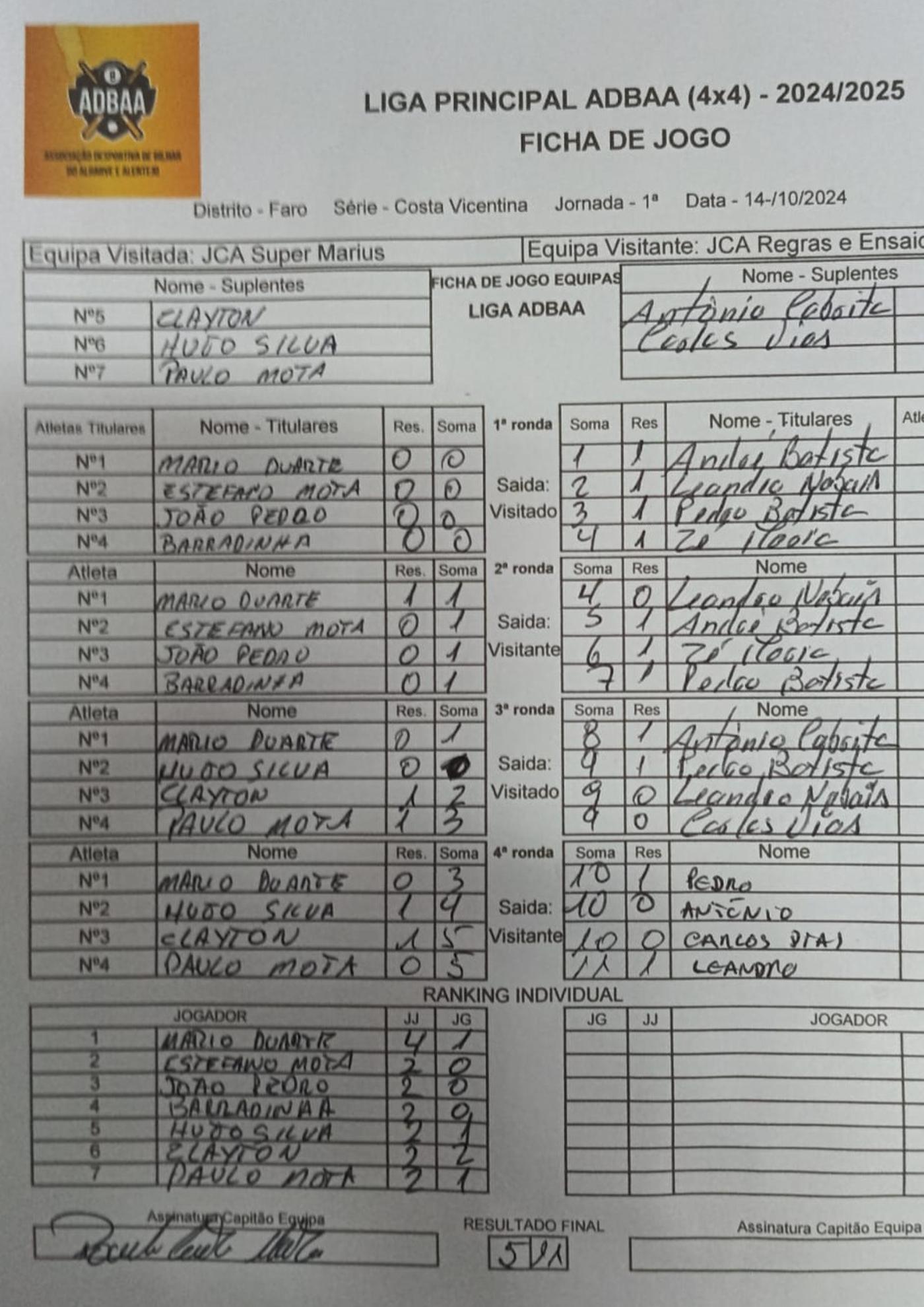 5 | 21 | JC ALJEZURENSE SUPER MARIUS | 4-12 | G D RENASCENTE ERA SAO TEOTONIO | 26/11/2024 | <Sem observações>