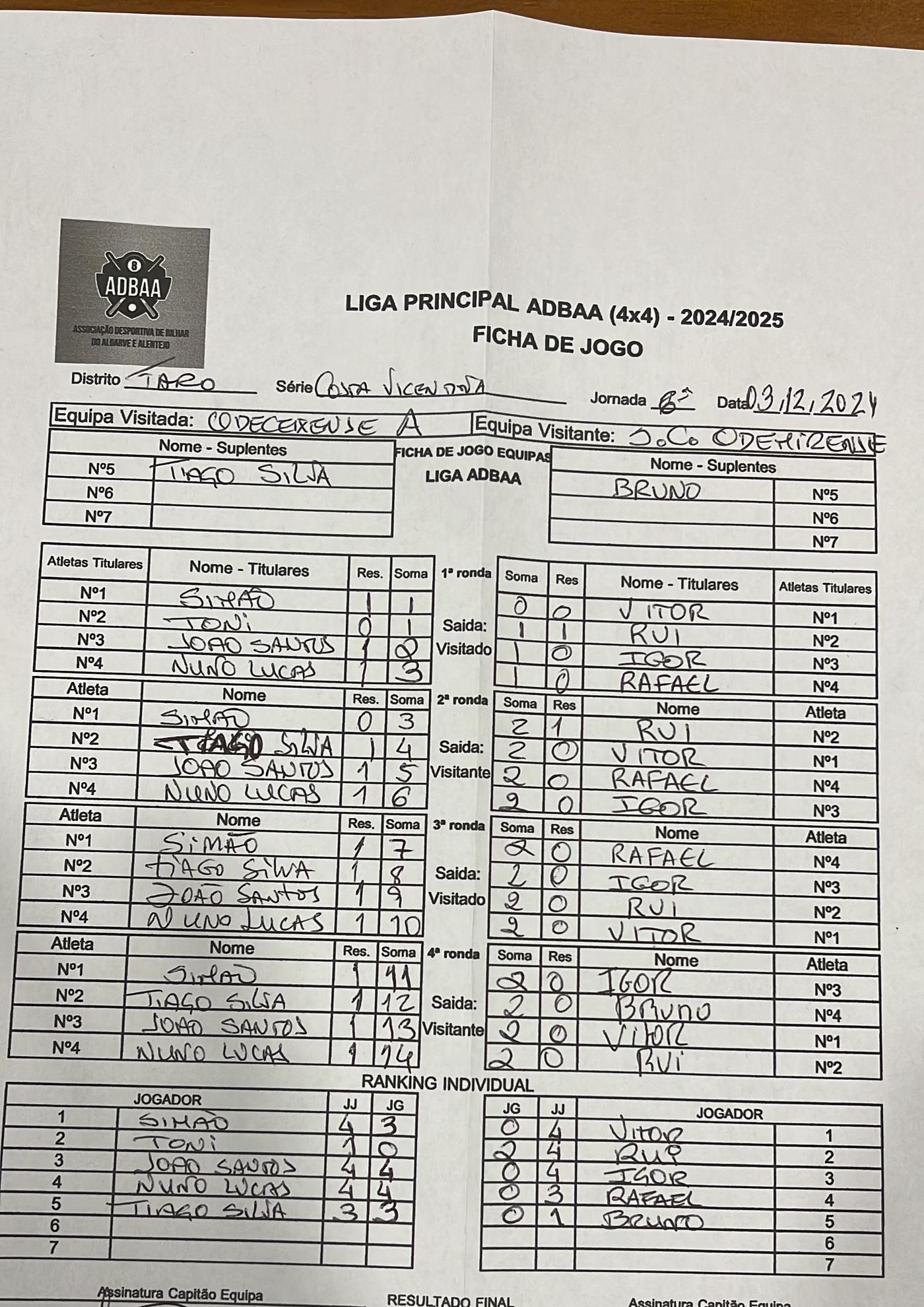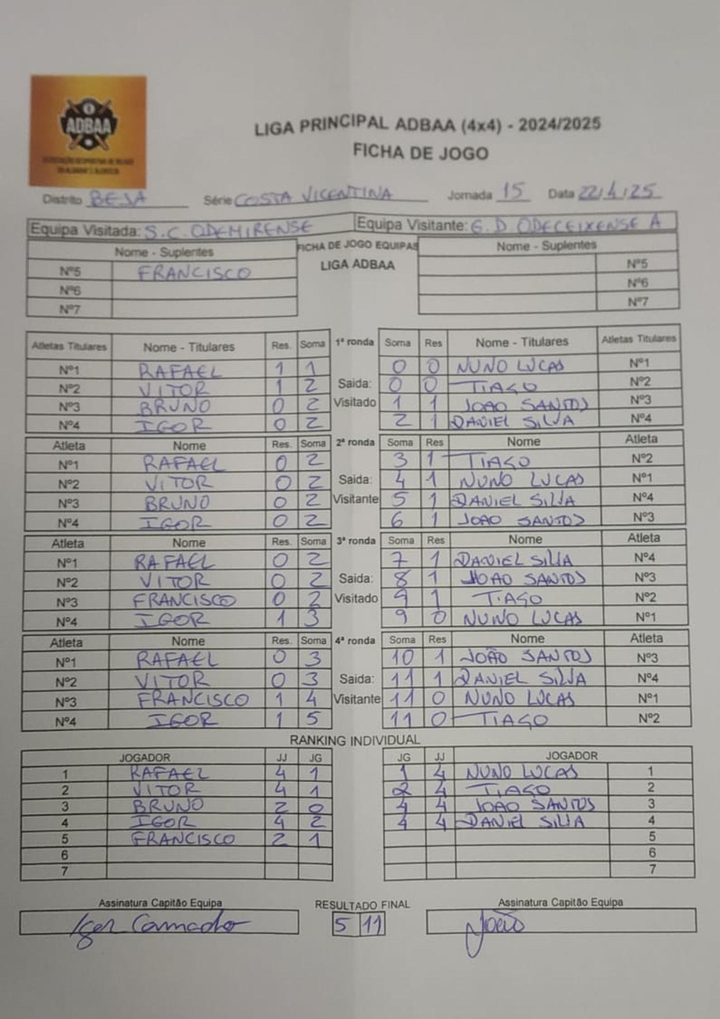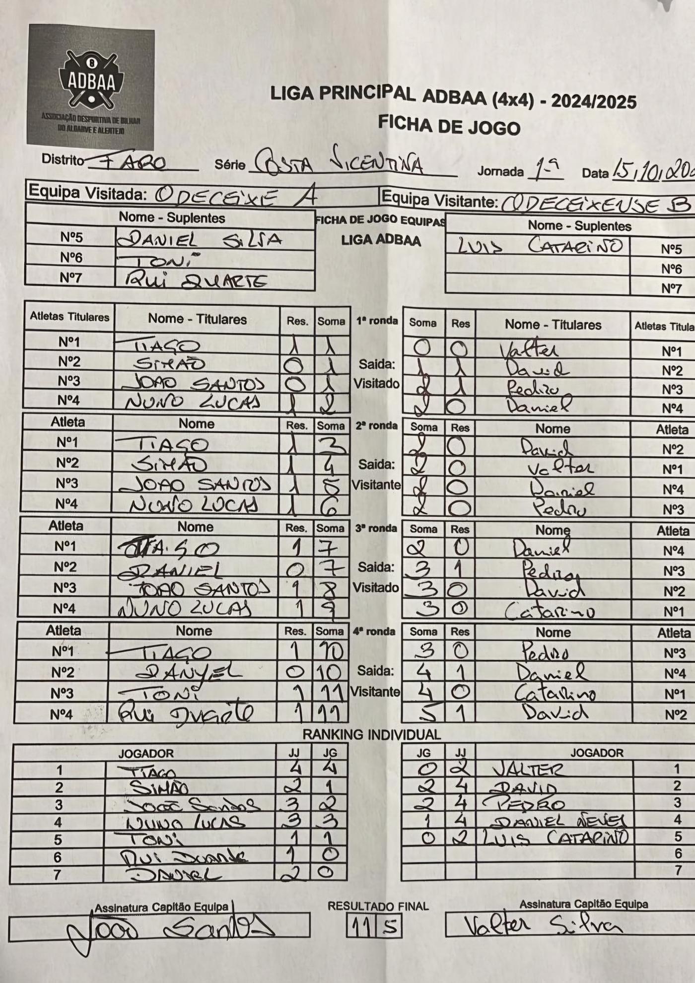 1 | 2 | G DESPORTIVO ODECEIXENSE A | 11-5 | G DESPORTIVO ODECEIXENSE B | 15/10/2024 | <Sem observações>