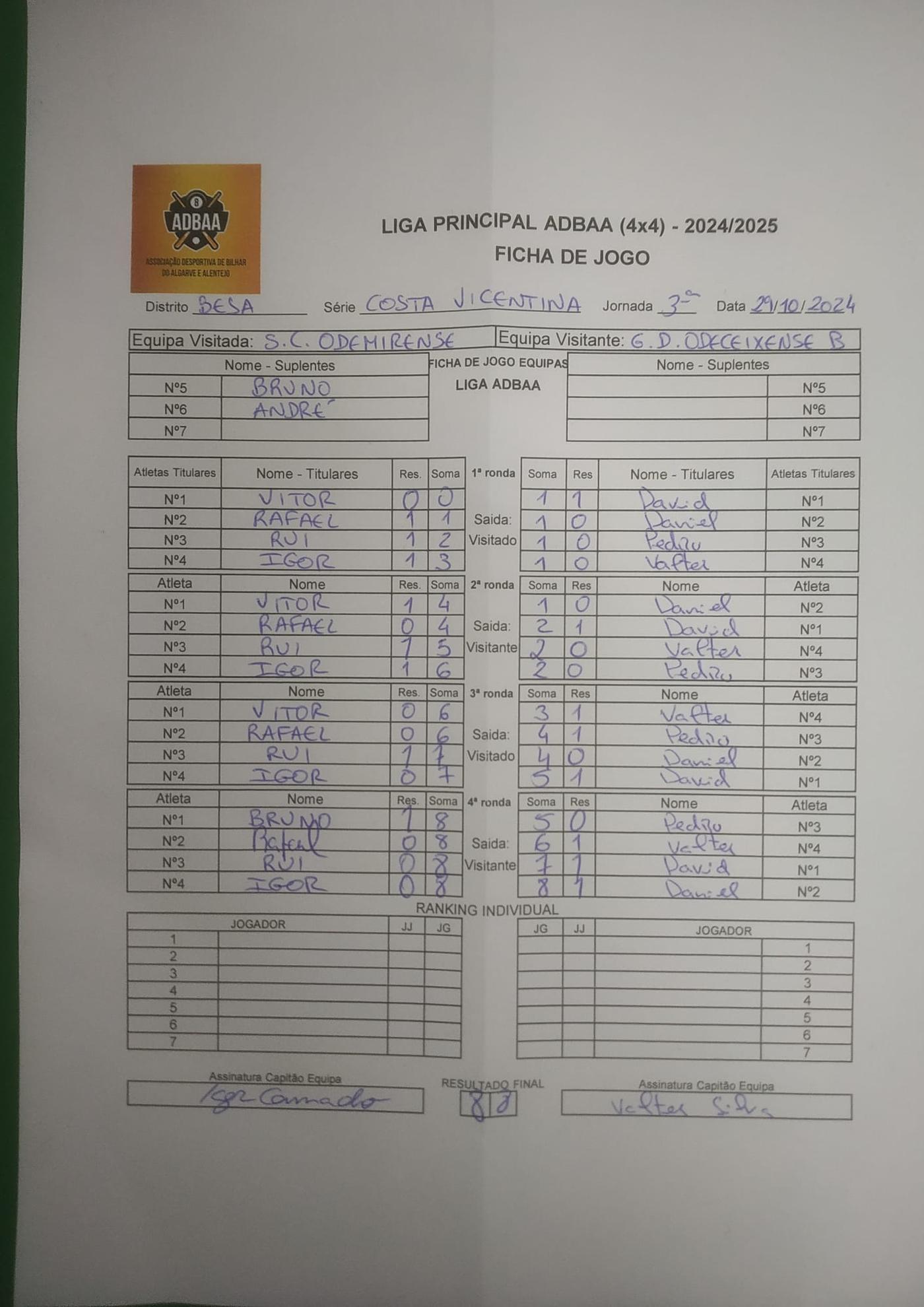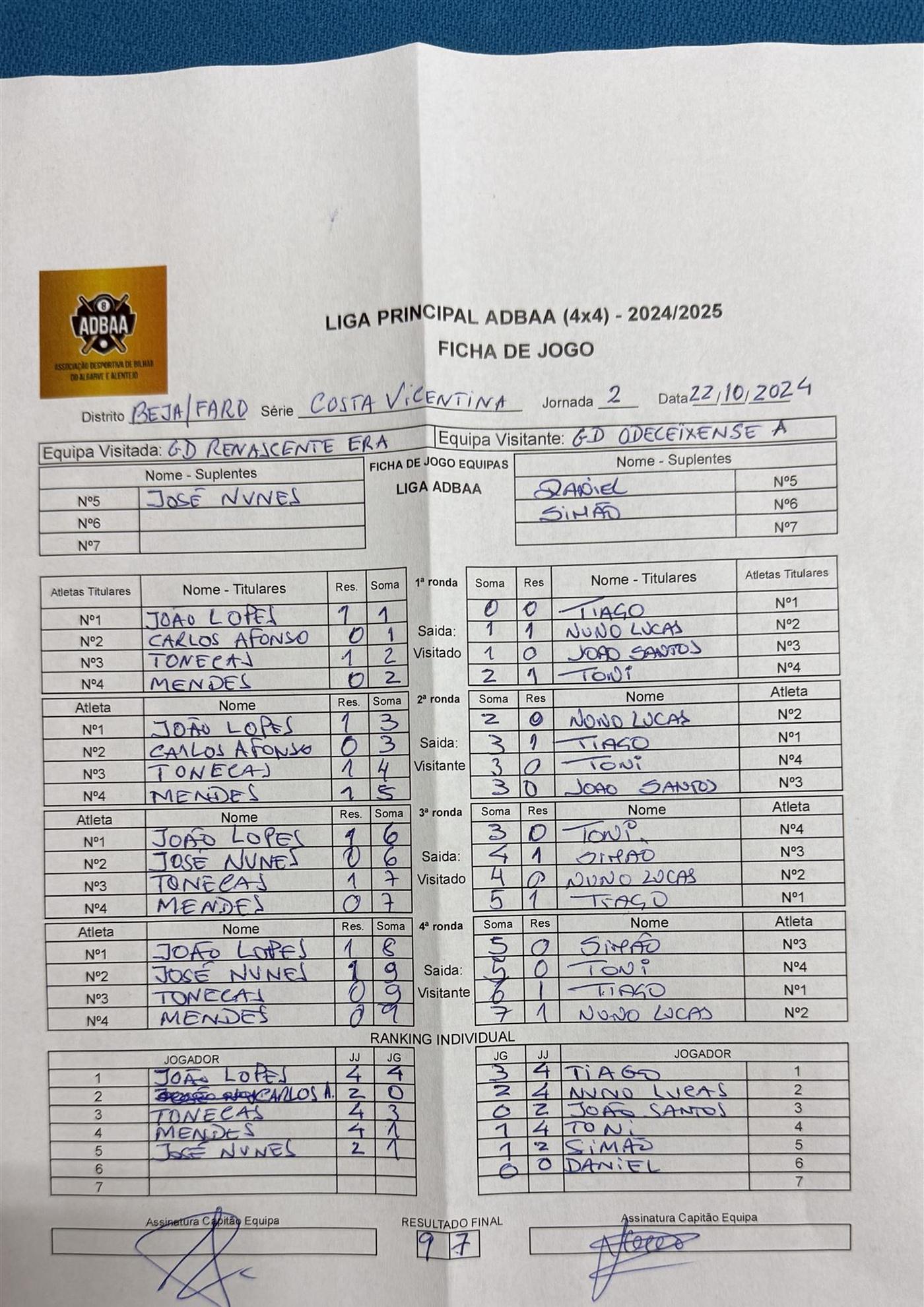 2 | 6 | G D RENASCENTE ERA SAO TEOTONIO | 9-7 | G DESPORTIVO ODECEIXENSE A | 22/10/2024 | <Sem observações>