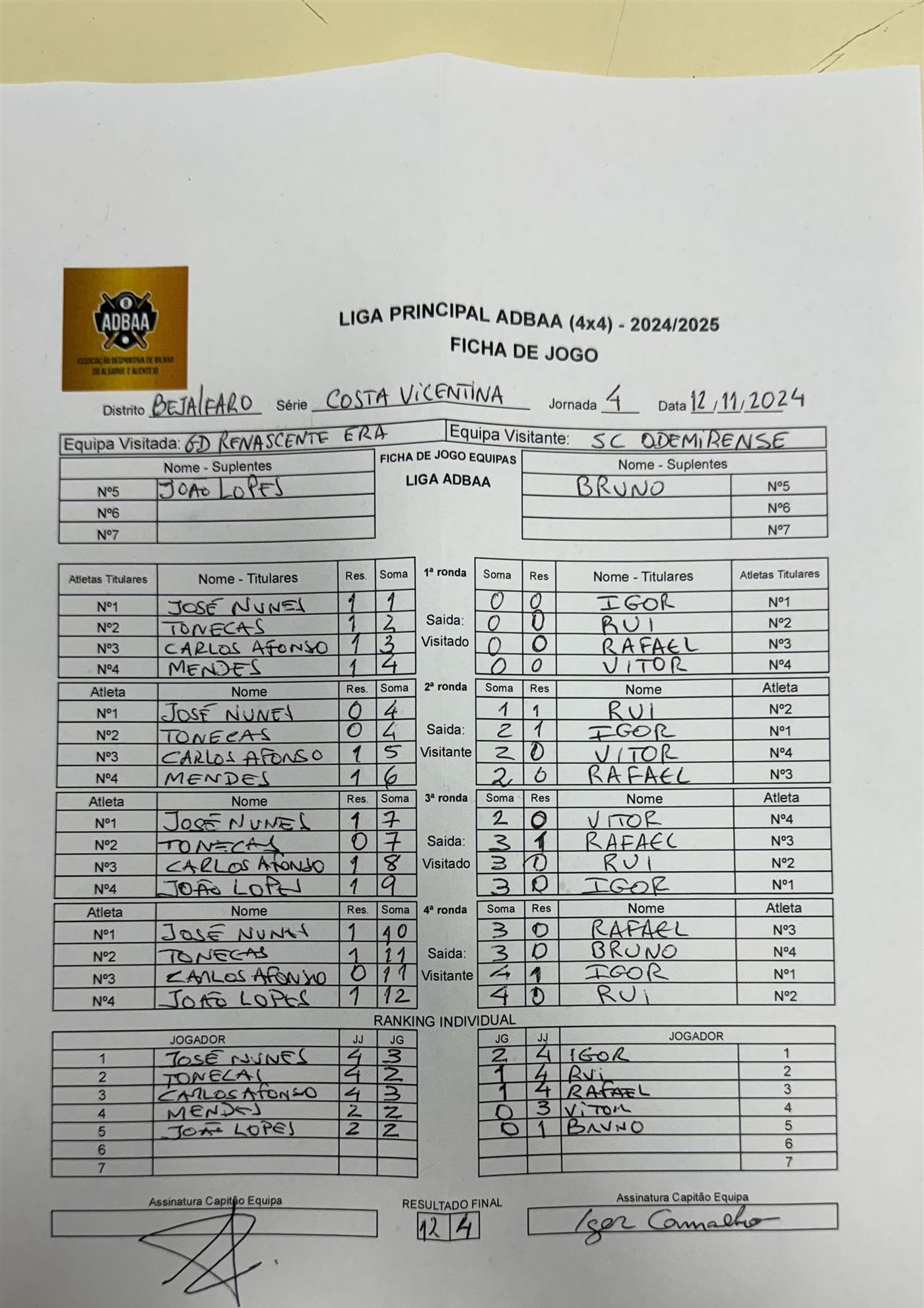 4 | 16 | G D RENASCENTE ERA SAO TEOTONIO | 12-4 | S C ODEMIRENSE | 12/11/2024 | <Sem observações>