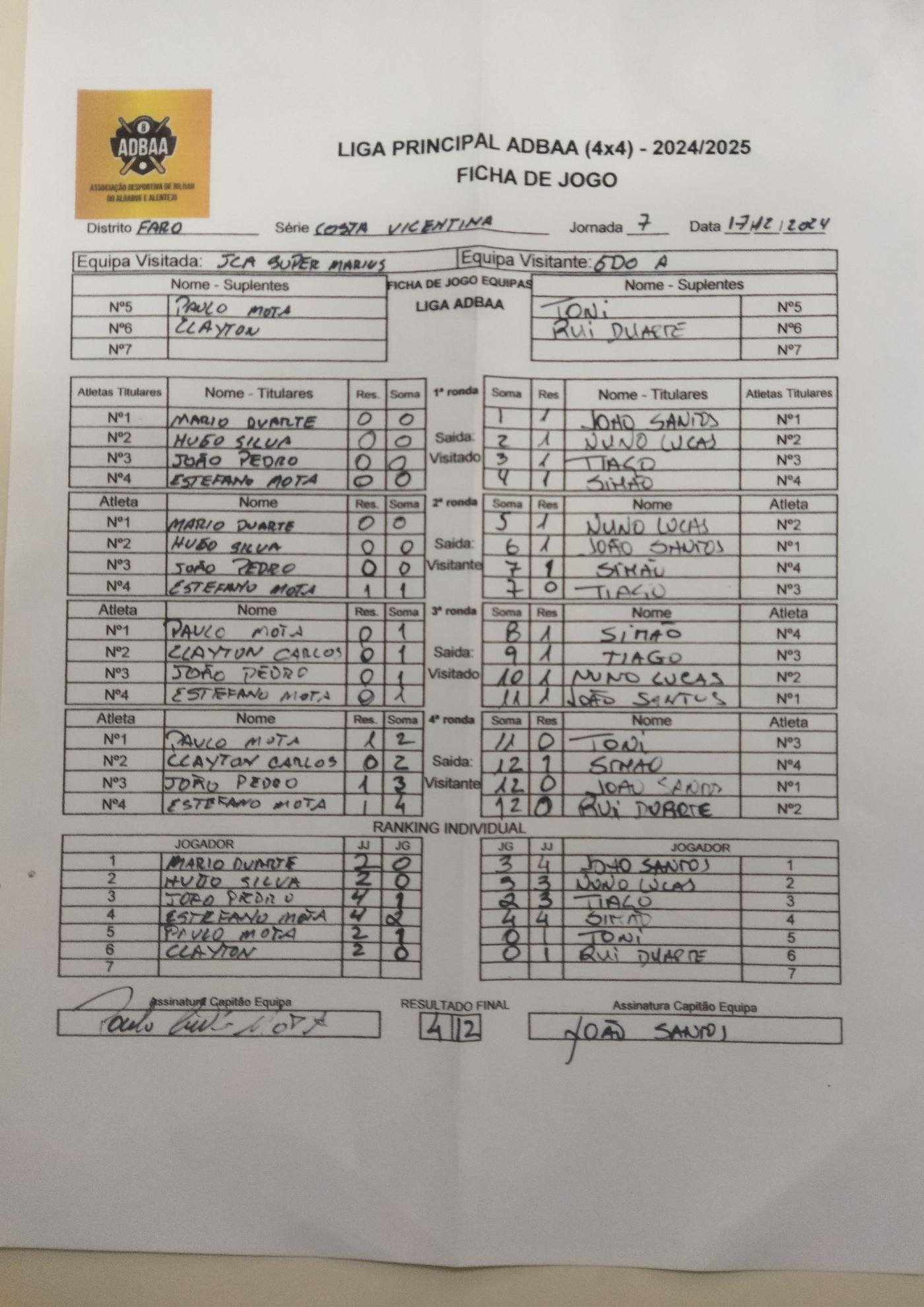 7 | 33 | JC ALJEZURENSE SUPER MARIUS | 4-12 | G DESPORTIVO ODECEIXENSE A | 17/12/2024 | <Sem observações>