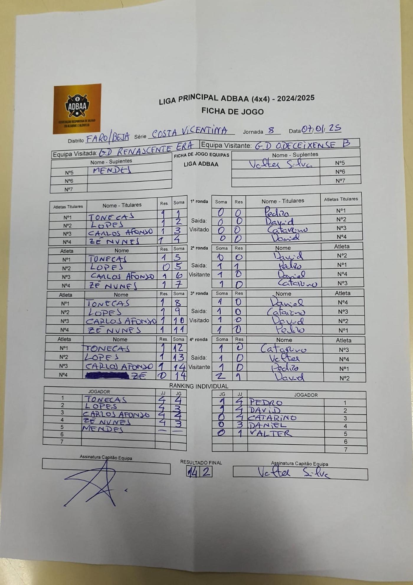 8 | 36 | G D RENASCENTE ERA SAO TEOTONIO | 14-2 | G DESPORTIVO ODECEIXENSE B | 07/01/2025 | <Sem observações>
