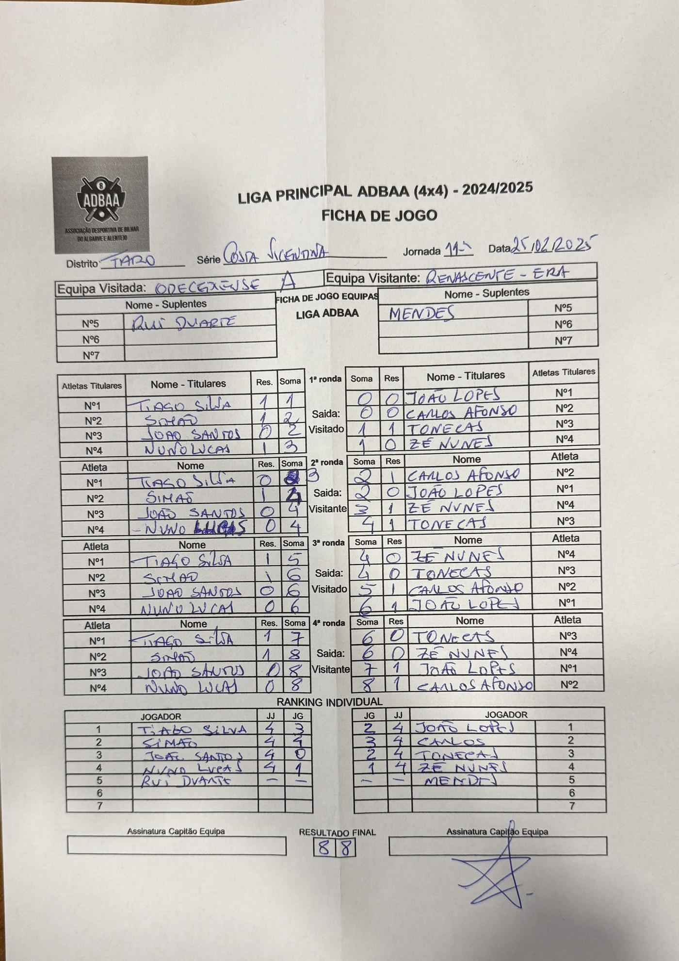 11 | 55 | G D RENASCENTE MONTE ZECA | 6-10 | JC ALJEZURENSE REGRAS E ENSAIOS | 25/02/2025 | <Sem observações>