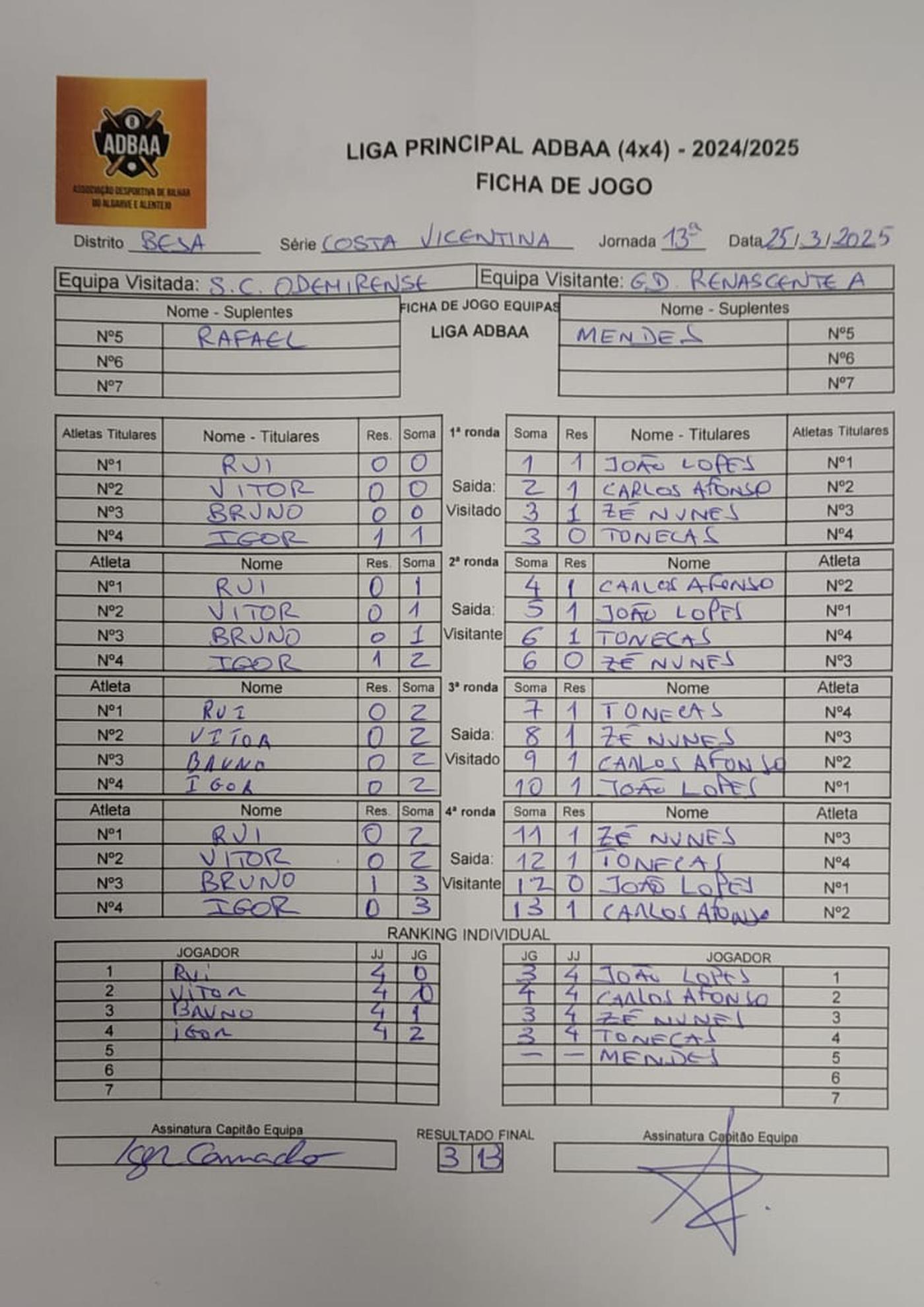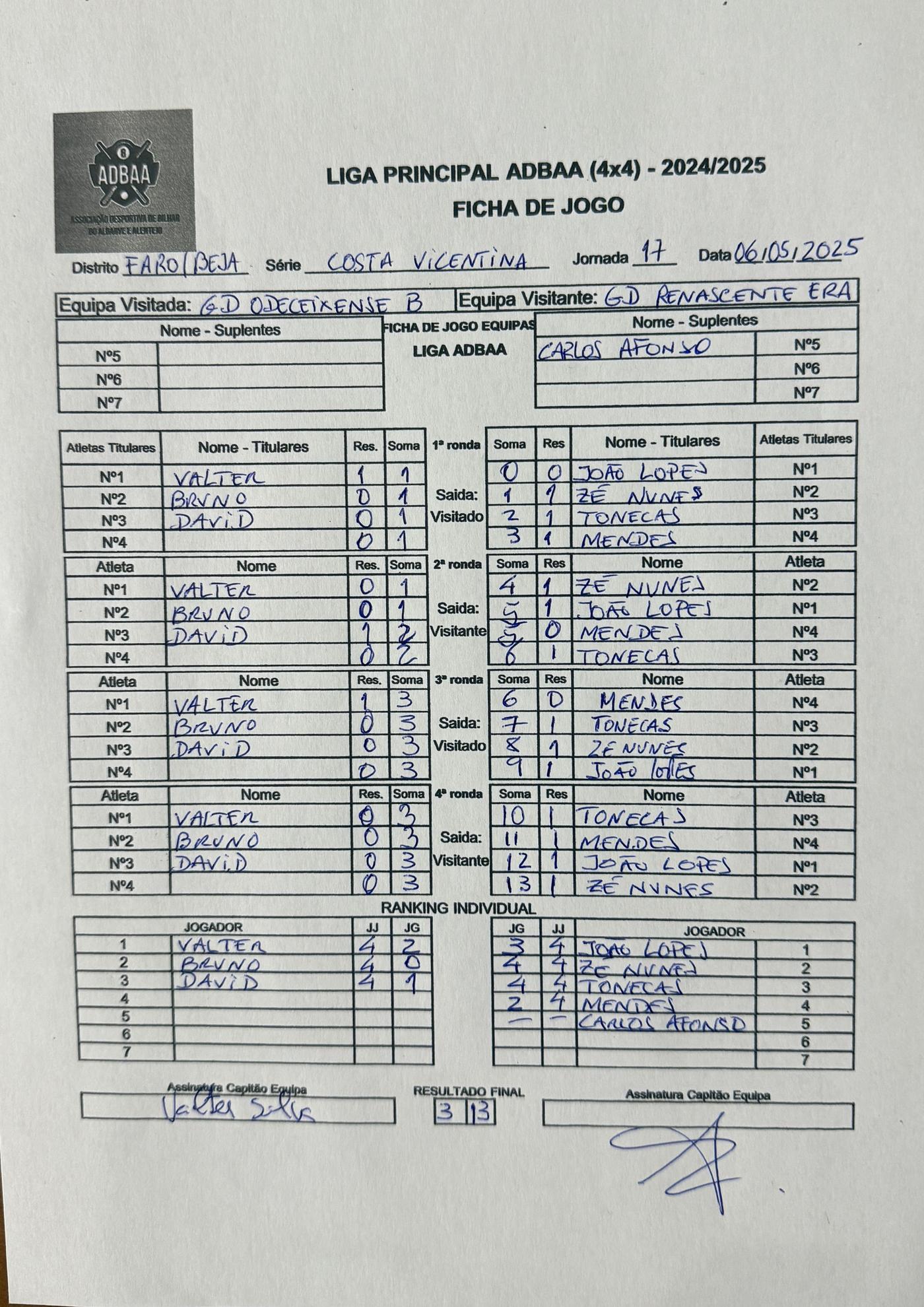 17 | 81 | G DESPORTIVO ODECEIXENSE B | 3-13 | G D RENASCENTE ERA SAO TEOTONIO | 06/05/2025 | <Sem observações>