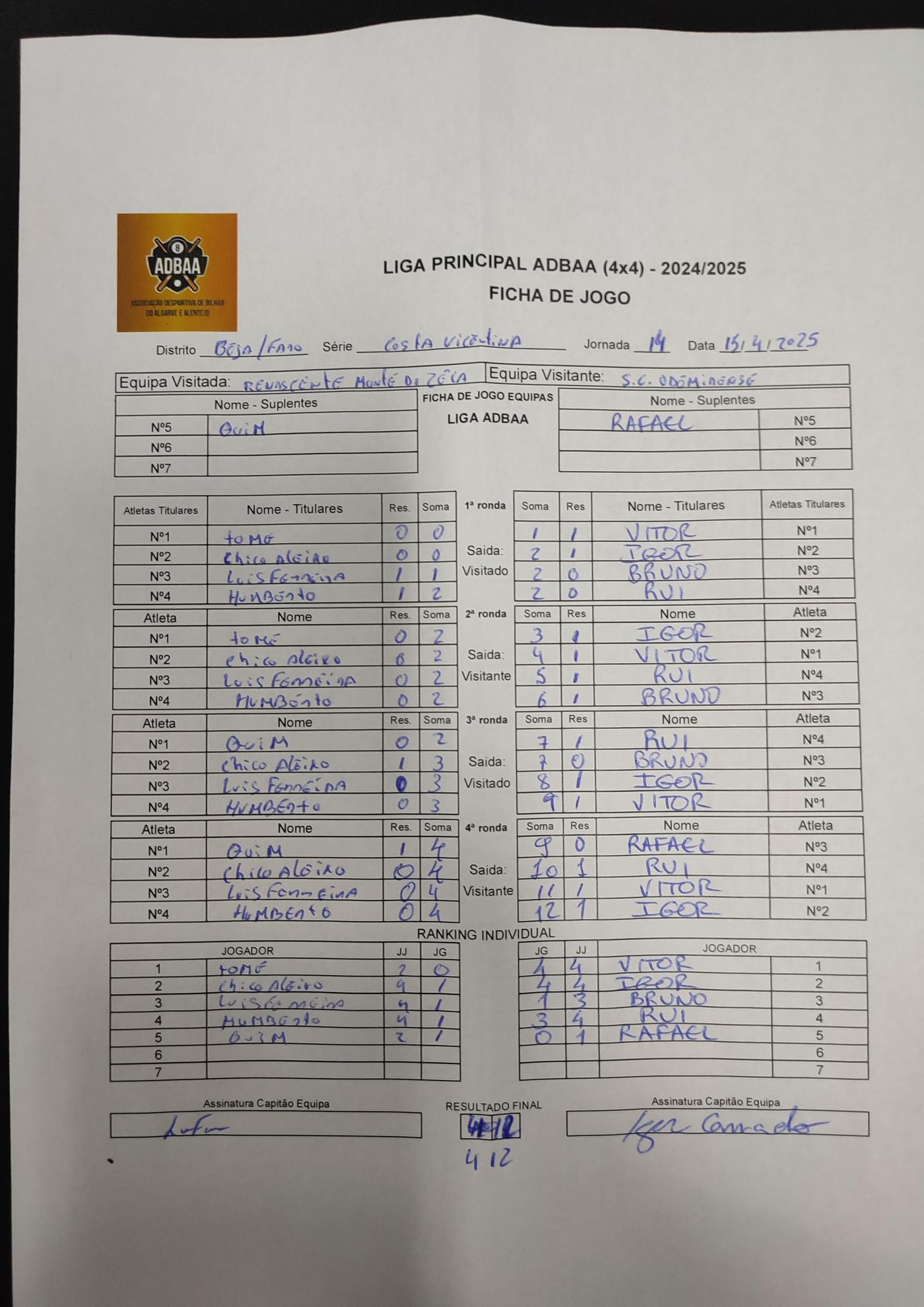 14 | 67 | G D RENASCENTE MONTE ZECA | 4-12 | S C ODEMIRENSE | 15/04/2025 | <Sem observações>