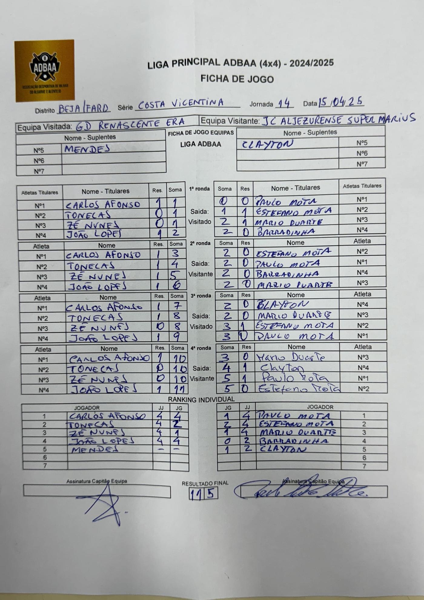 14 | 66 | G D RENASCENTE ERA SAO TEOTONIO | 11-5 | JC ALJEZURENSE SUPER MARIUS | 15/04/2025 | <Sem observações>
