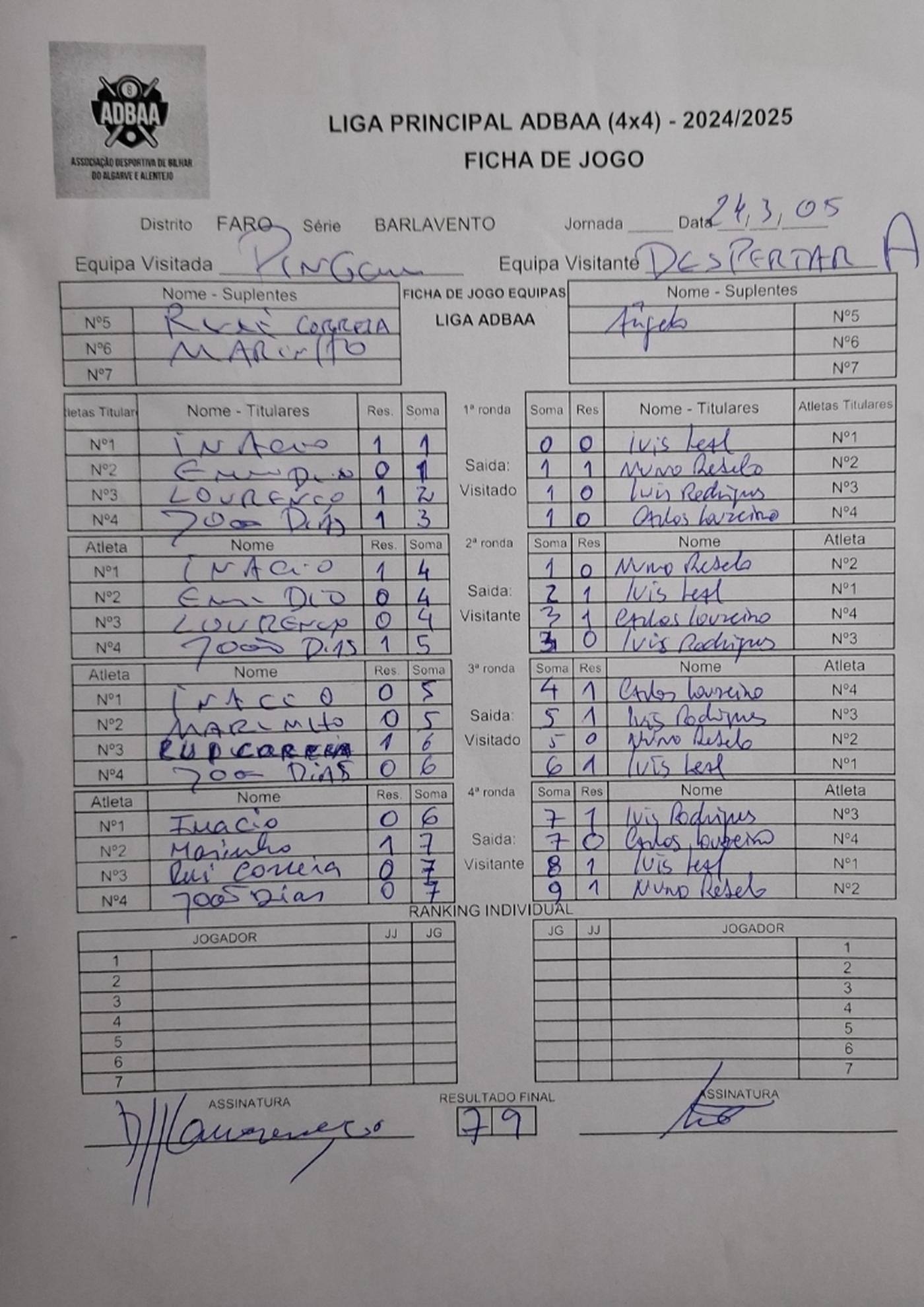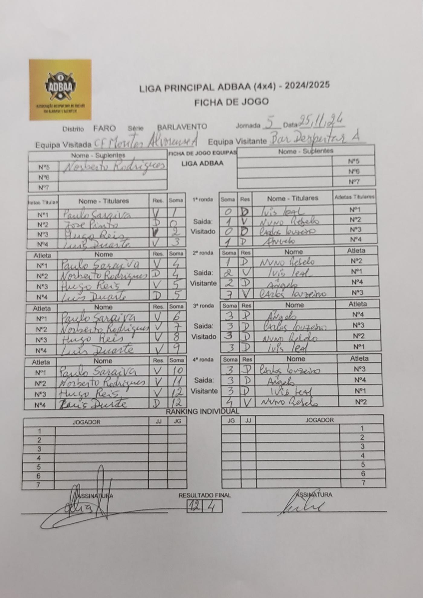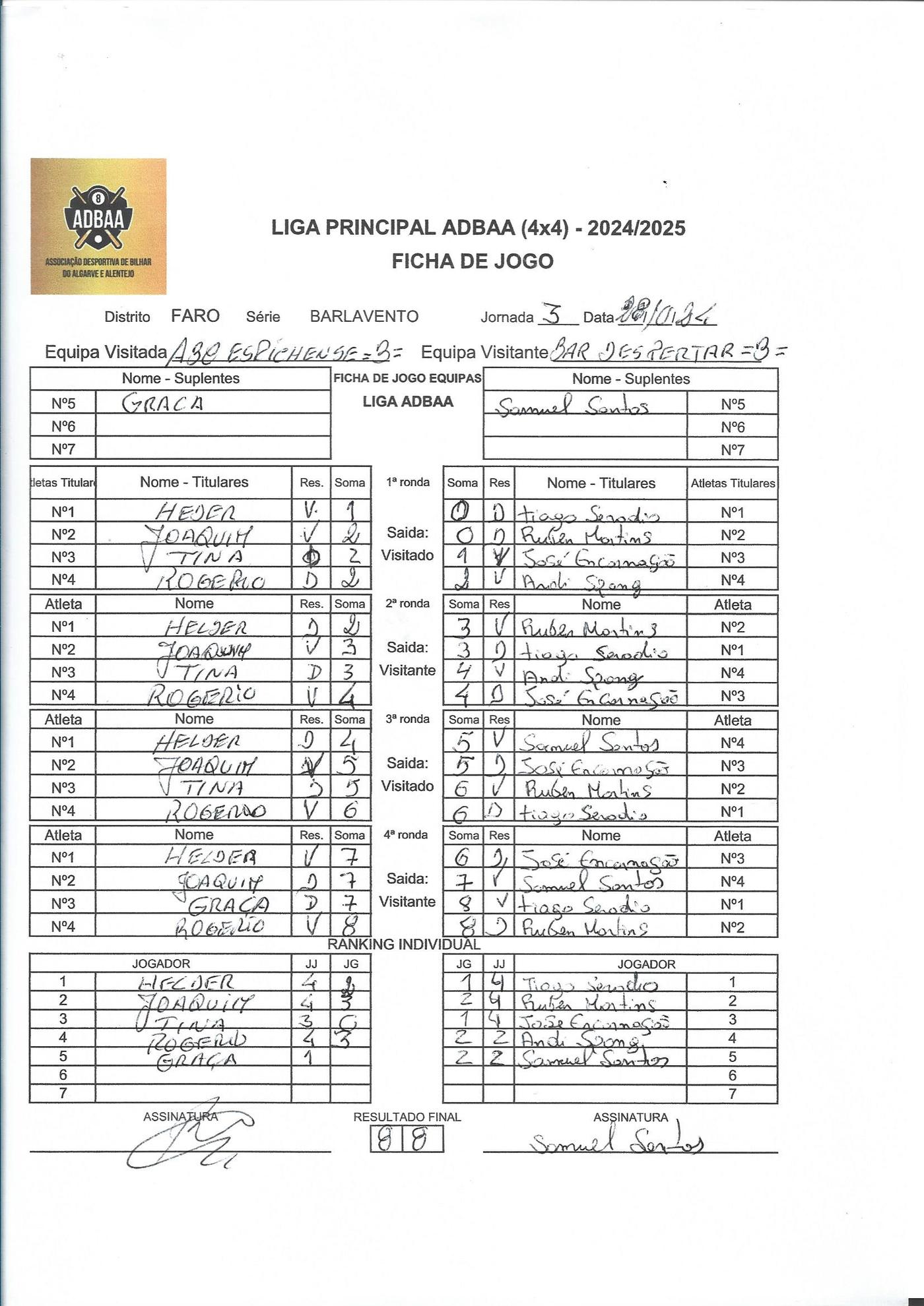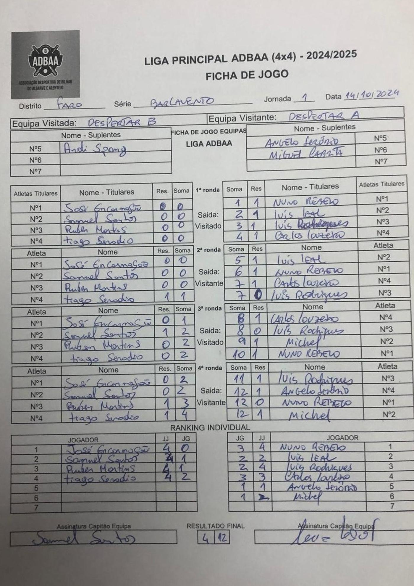 1 | 1 | BAR DESPERTAR B | 4-12 | BAR DESPERTAR A | 14/10/2024 | <Sem observações> |