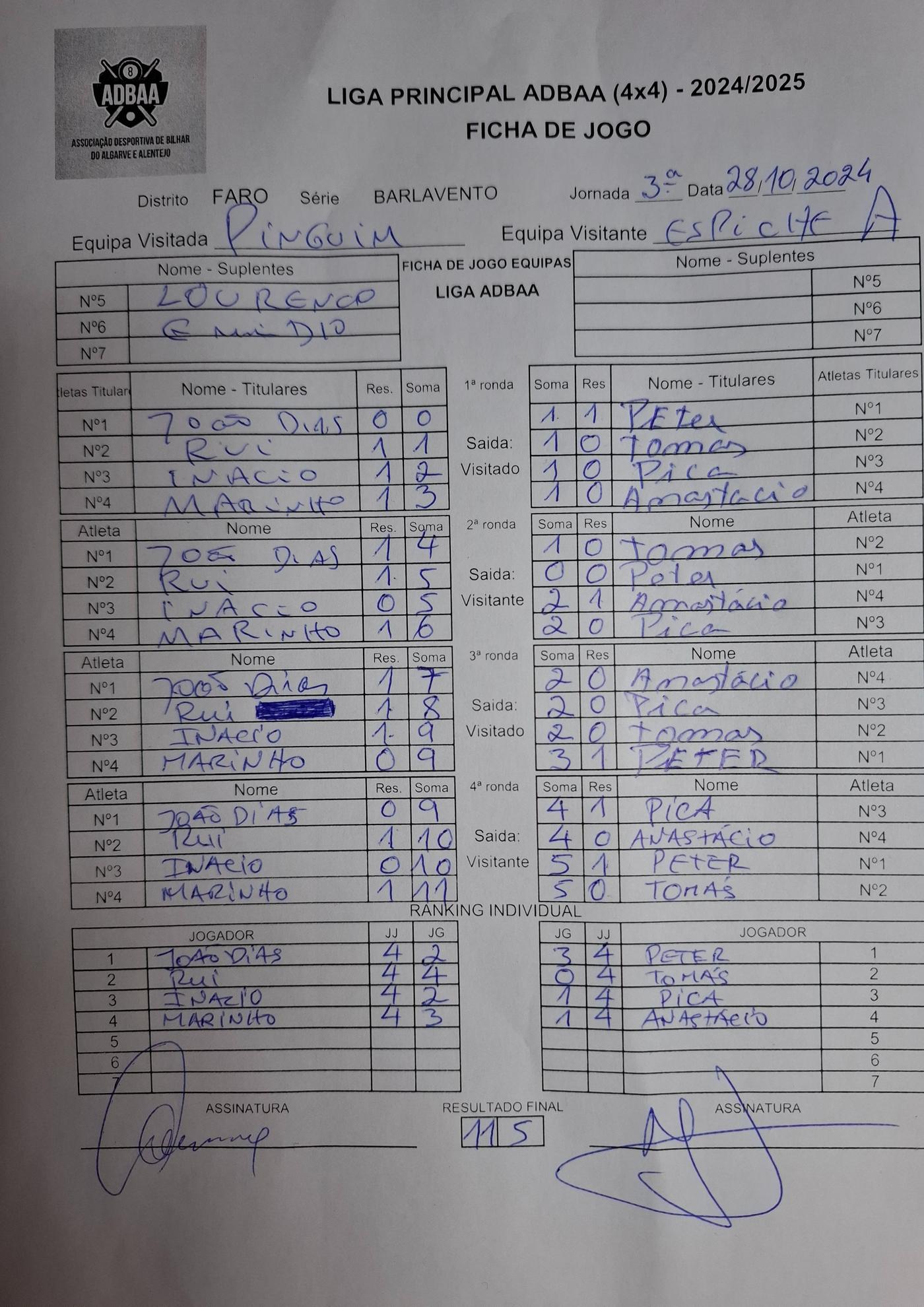 3 | 13 | PINGUIM | 11-5 | ABC ESPICHENSE A | 28/10/2024 | <Sem observações> |