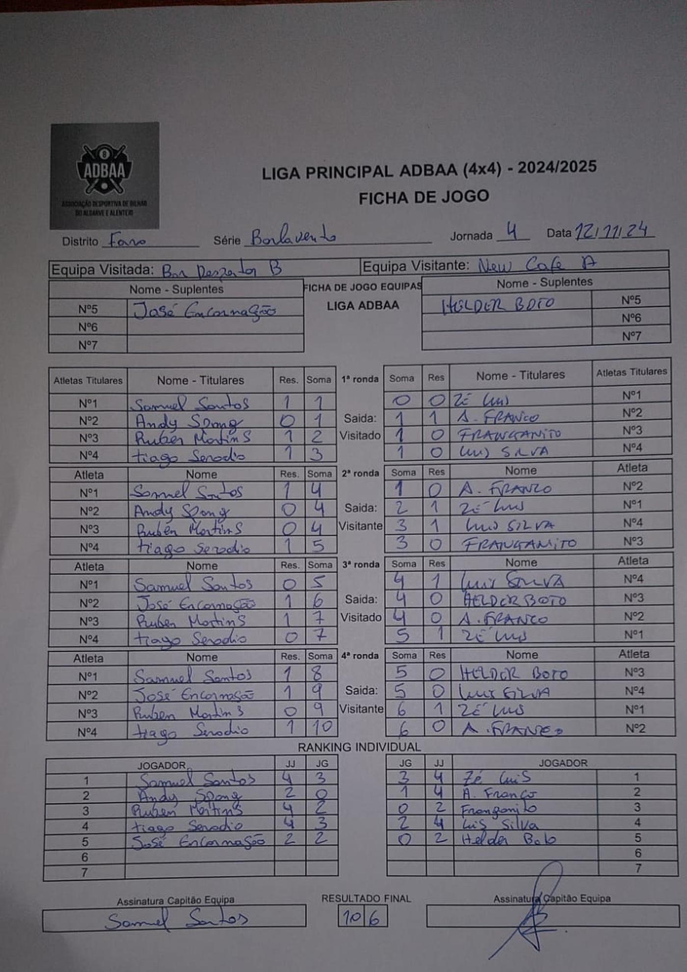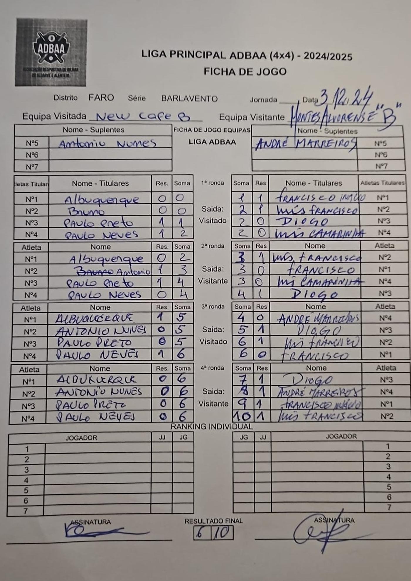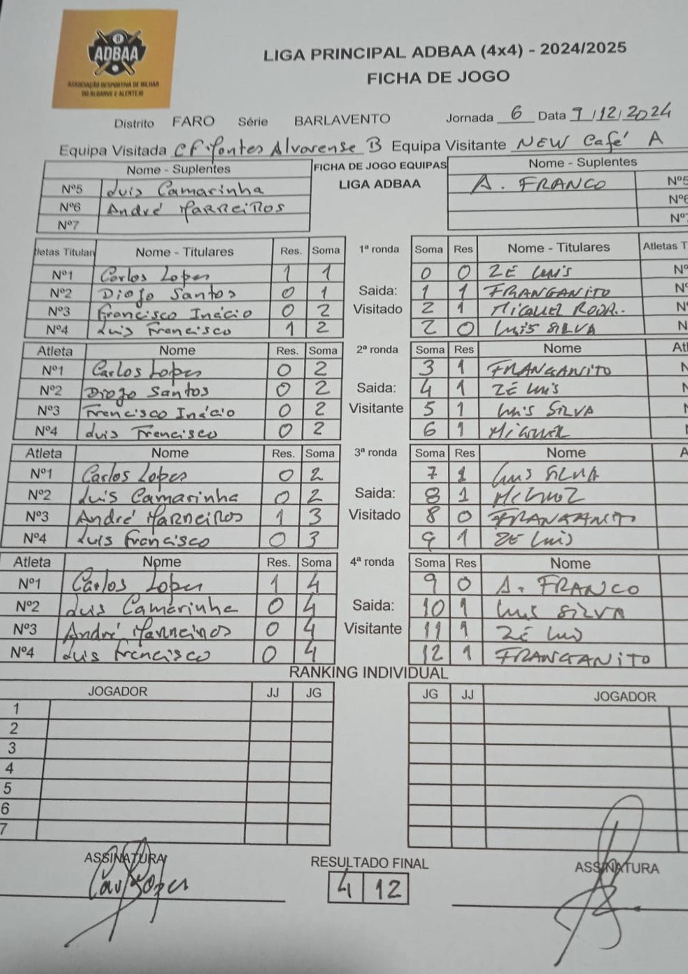 6 | 31 | C.F.MONTES ALVORENSE B | 4-12 | NEW CAFE A | 09/12/2024 | <Sem observações> |