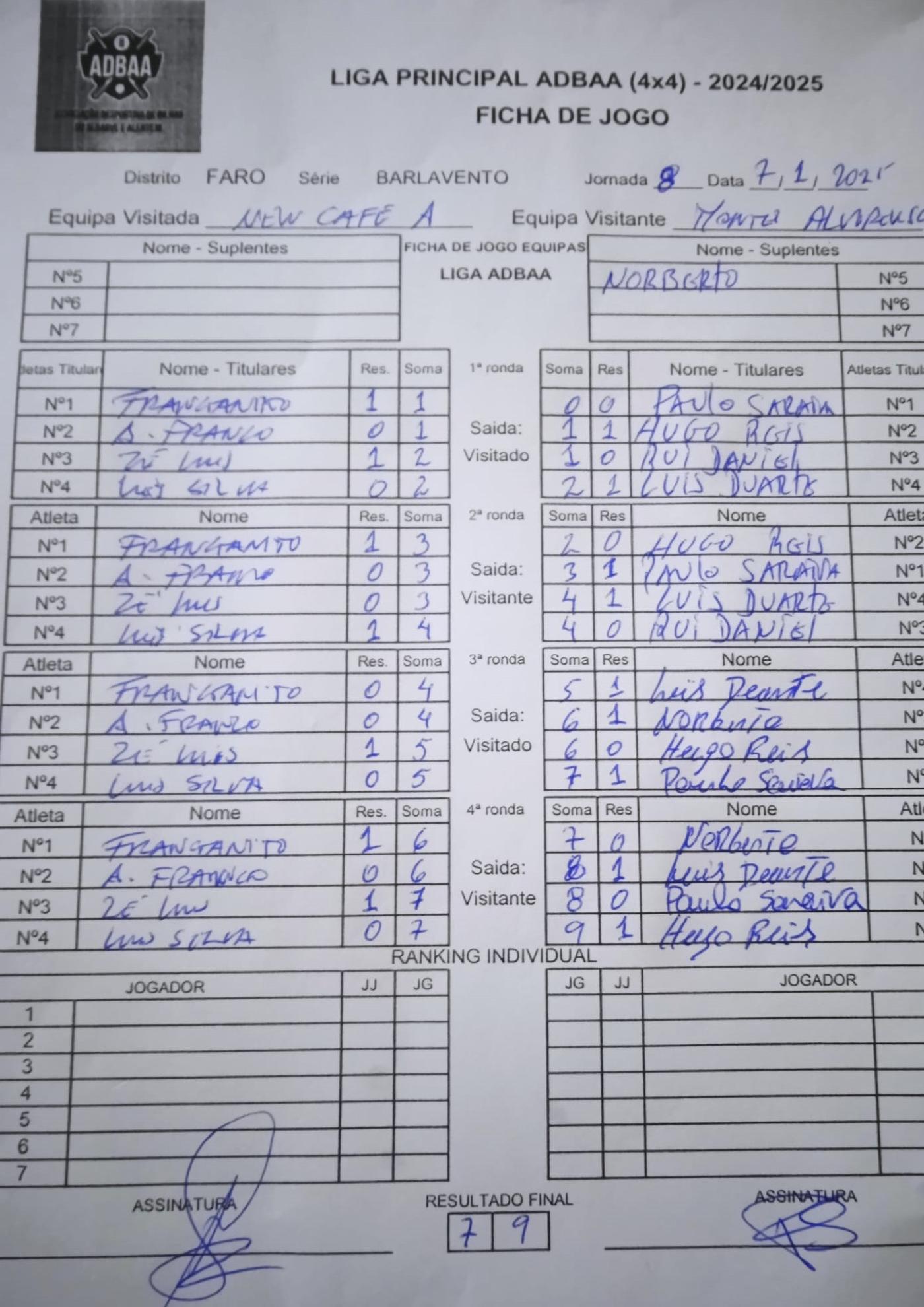 8 | 40 | NEW CAFE A | 7-9 | C.F.MONTES ALVORENSE A | 07/01/2025 | <Sem observações> |