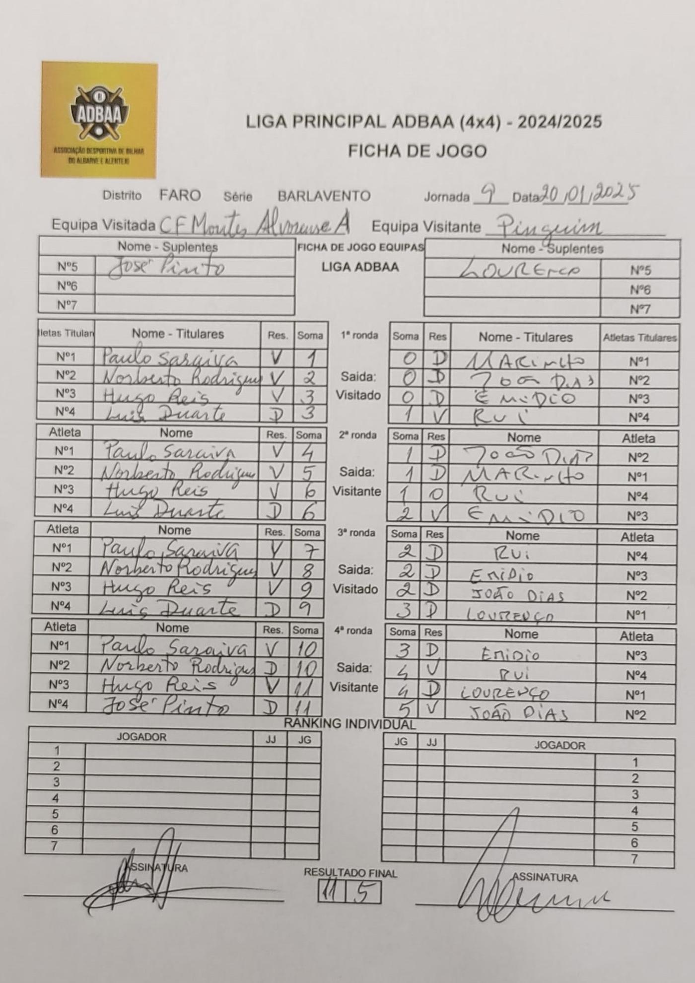 9 | 45 | C.F.MONTES ALVORENSE A | 11-5 | PINGUIM | 20/01/2025 | <Sem observações> |