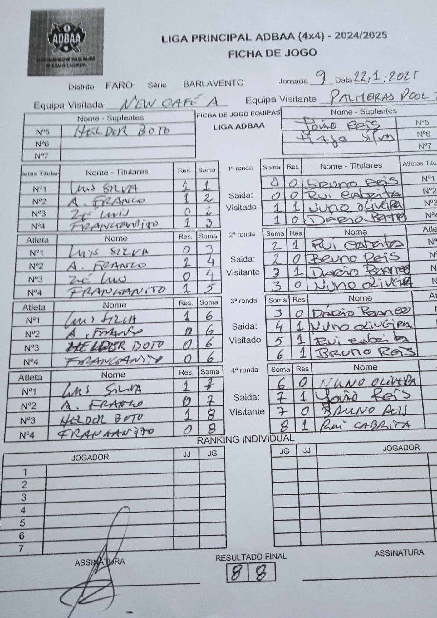 9 | 44 | PALMEIRAS POOL TEAM | 8-8 | NEW CAFE A | 21/01/2025 | <Sem observações> |