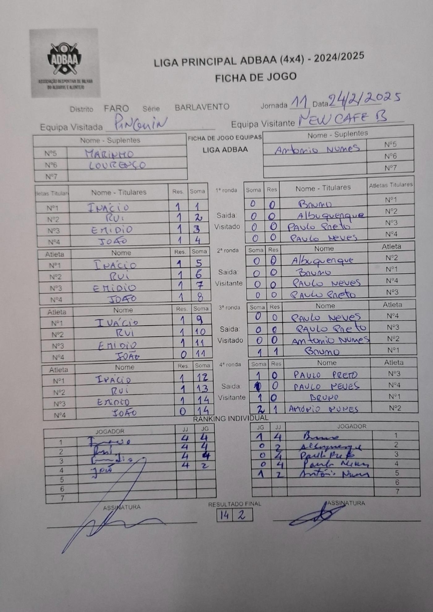 11 | 54 | PINGUIM | 14-2 | NEW CAFE B | 24/02/2025 | <Sem observações> |
