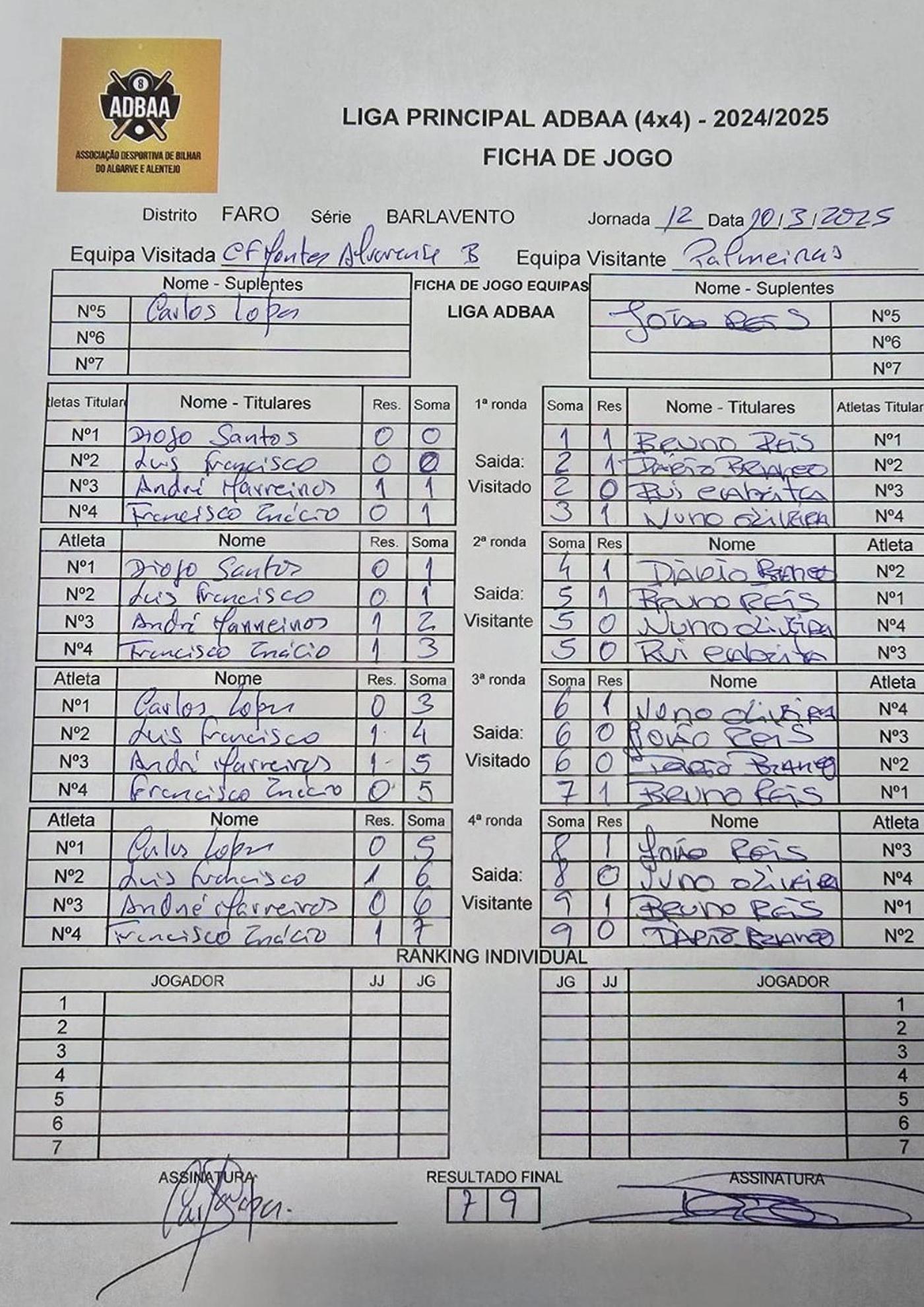 12 | 61 | C.F.MONTES ALVORENSE B | 7-9 | PALMEIRAS POOL TEAM | 10/03/2025 | <Sem observações> |