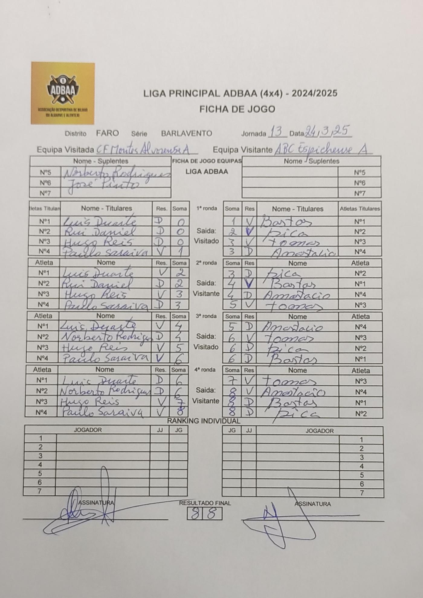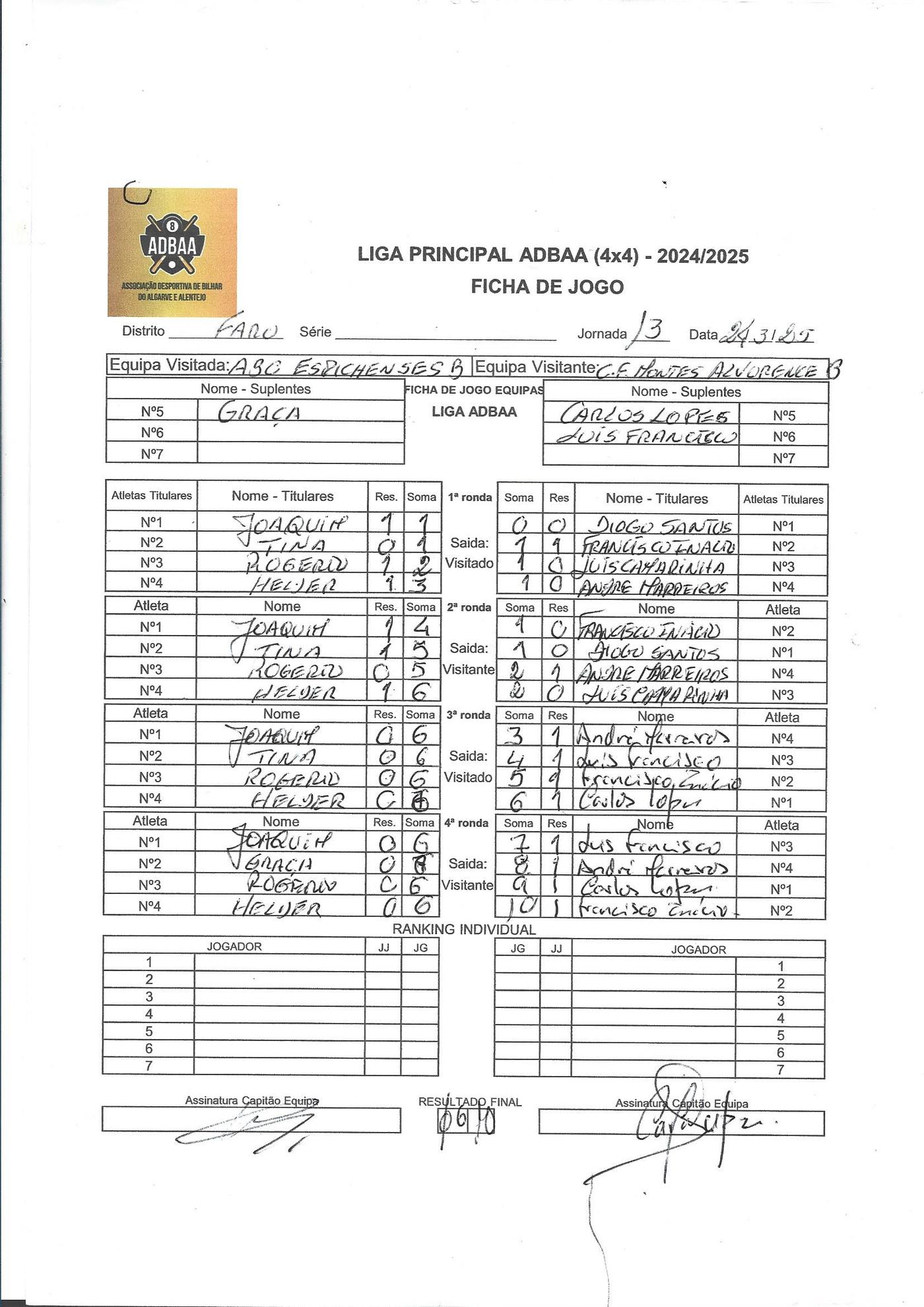 13 | 64 | C.F.MONTES ALVORENSE A | 8-8 | ABC ESPICHENSE A | 24/03/2025 | <Sem observações> |