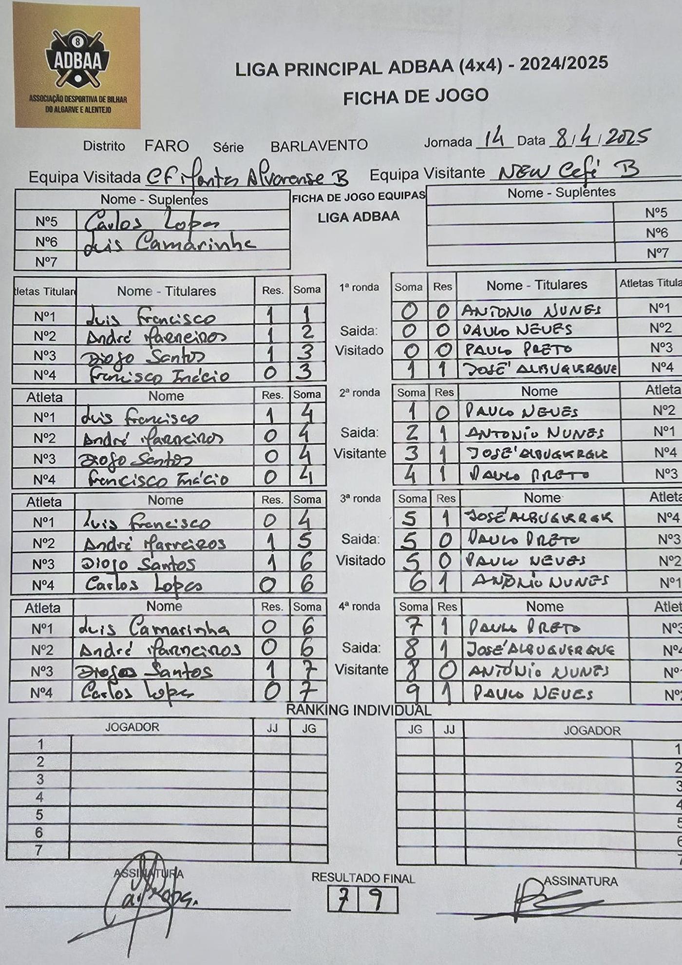 14 | 71 | C.F.MONTES ALVORENSE B | 7-9 | NEW CAFE B | 07/04/2025 | <Sem observações> |