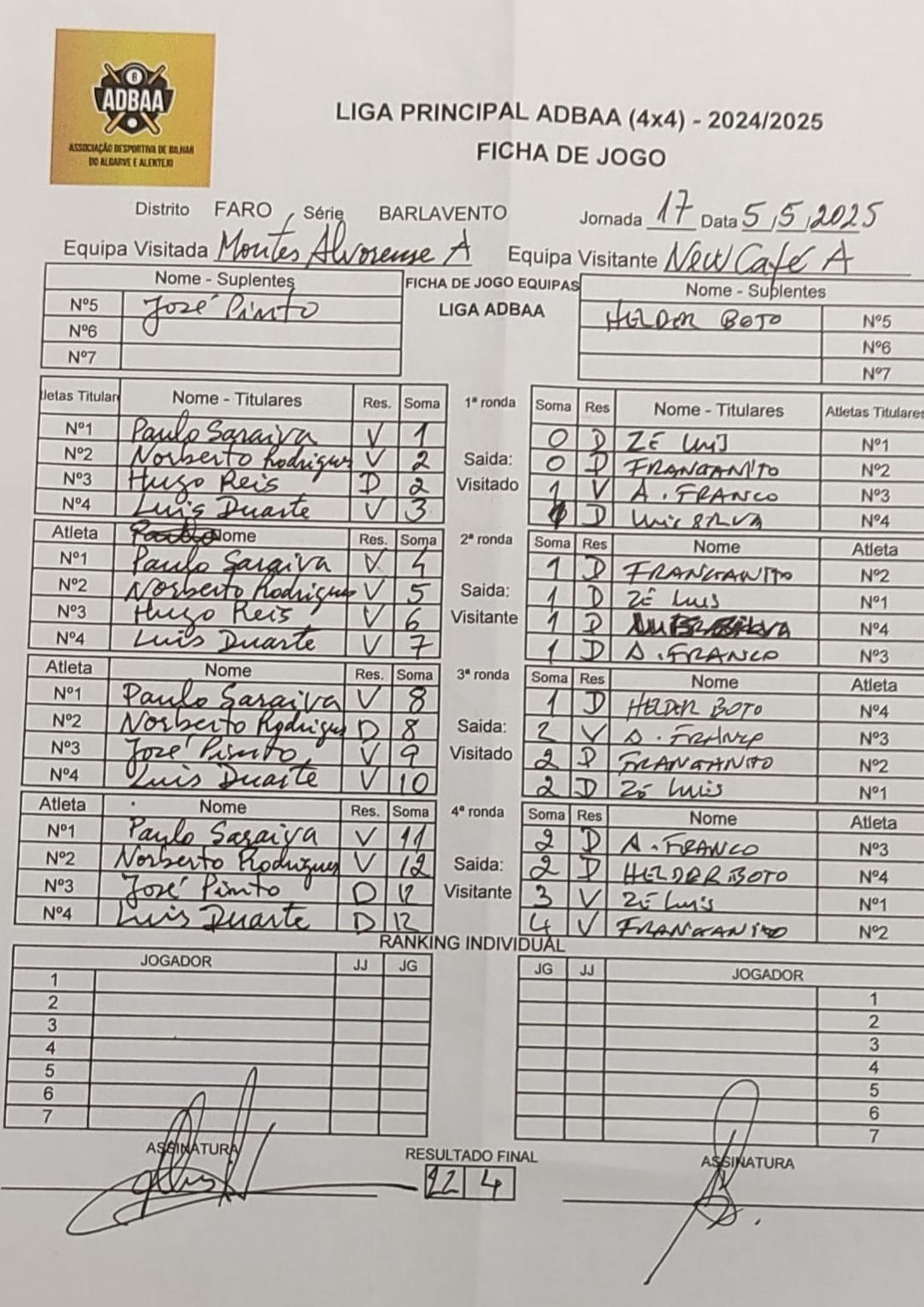 17 | 85 | C.F.MONTES ALVORENSE A | 12-4 | NEW CAFE A | 05/05/2025 | <Sem observações> |