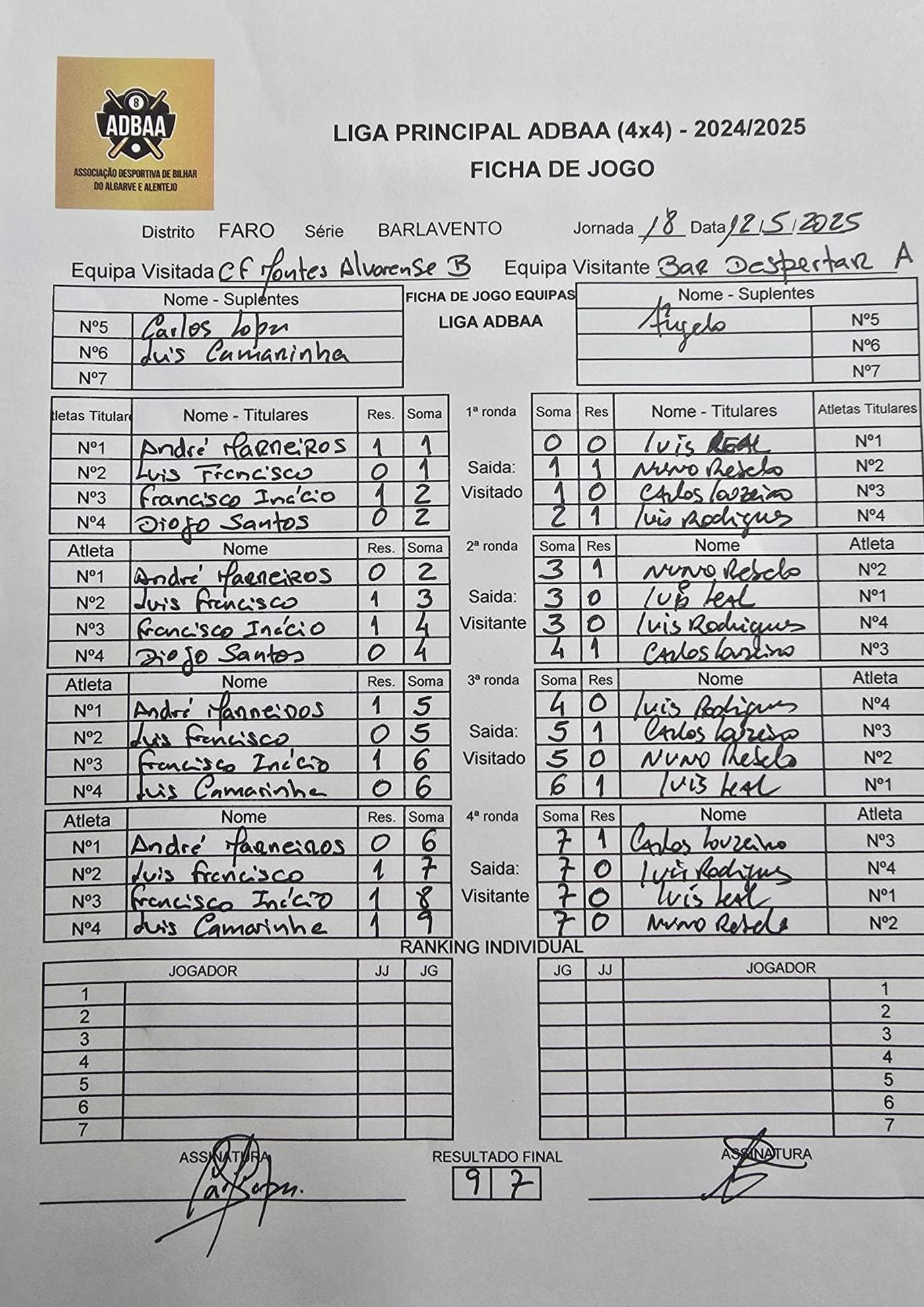 18 | 91 | C.F.MONTES ALVORENSE B | 9-7 | BAR DESPERTAR A | 12/05/2025 | <Sem observações> |