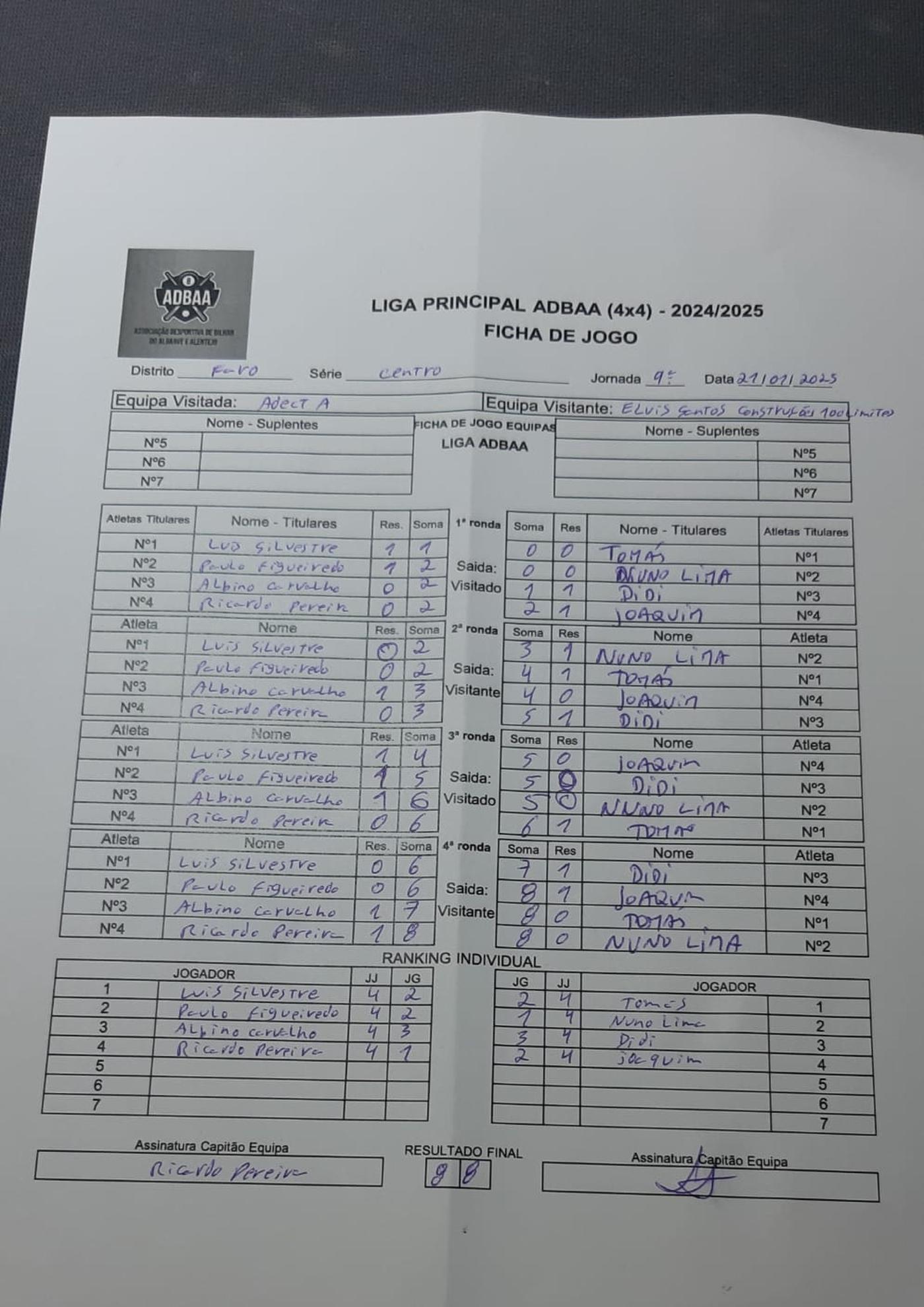 9 | 45 | ADECT A | 8-8 | ELVIS SANTOS CONSTRUÇÕES 100 LIMITES | 21/01/2025 | <Sem observações>