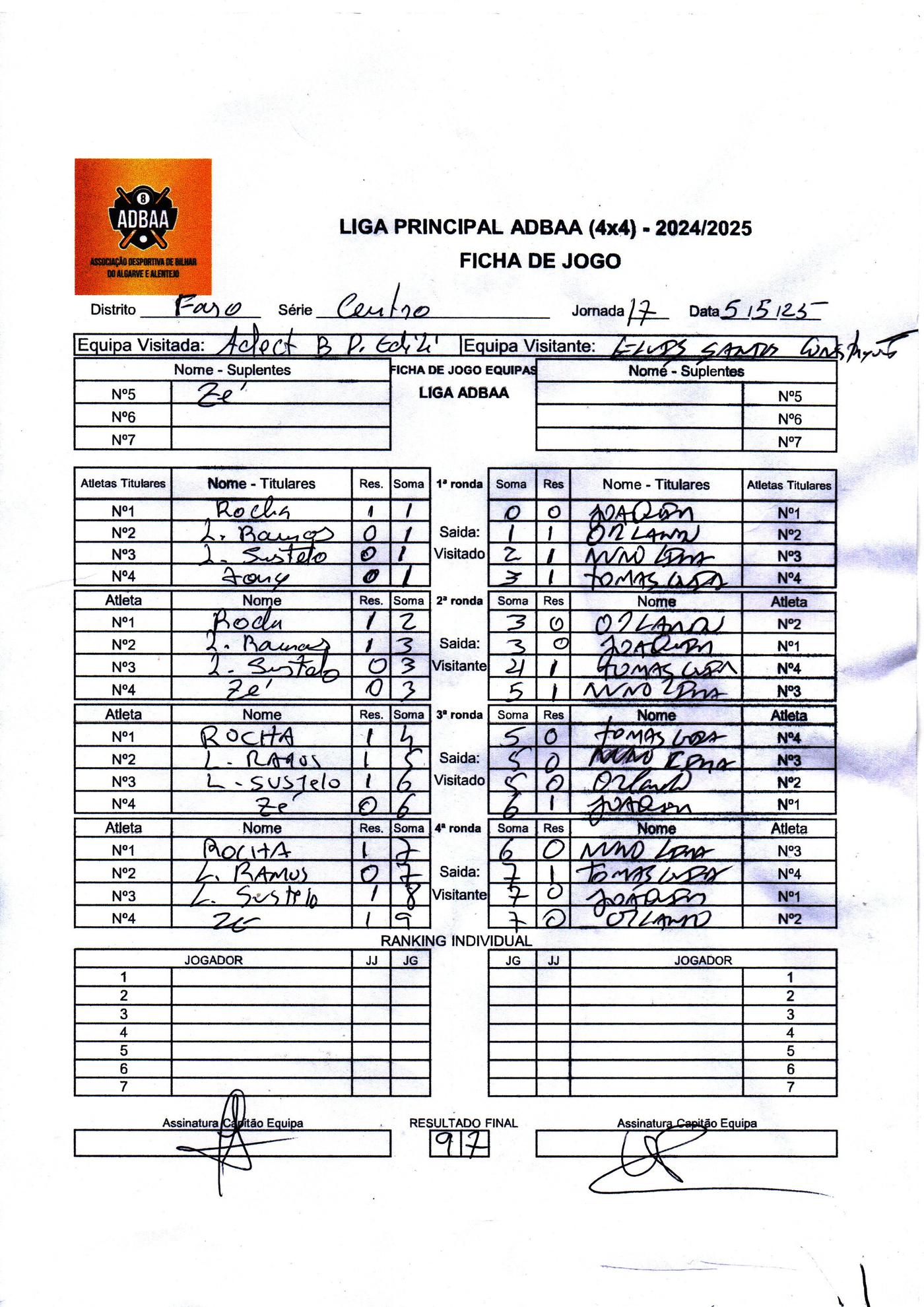 17 | 85 | ADECT B/ PASTELARIA EDILI | 9-7 | ELVIS SANTOS CONSTRUÇÕES 100 LIMITES | 05/05/2025 | <Sem observações>