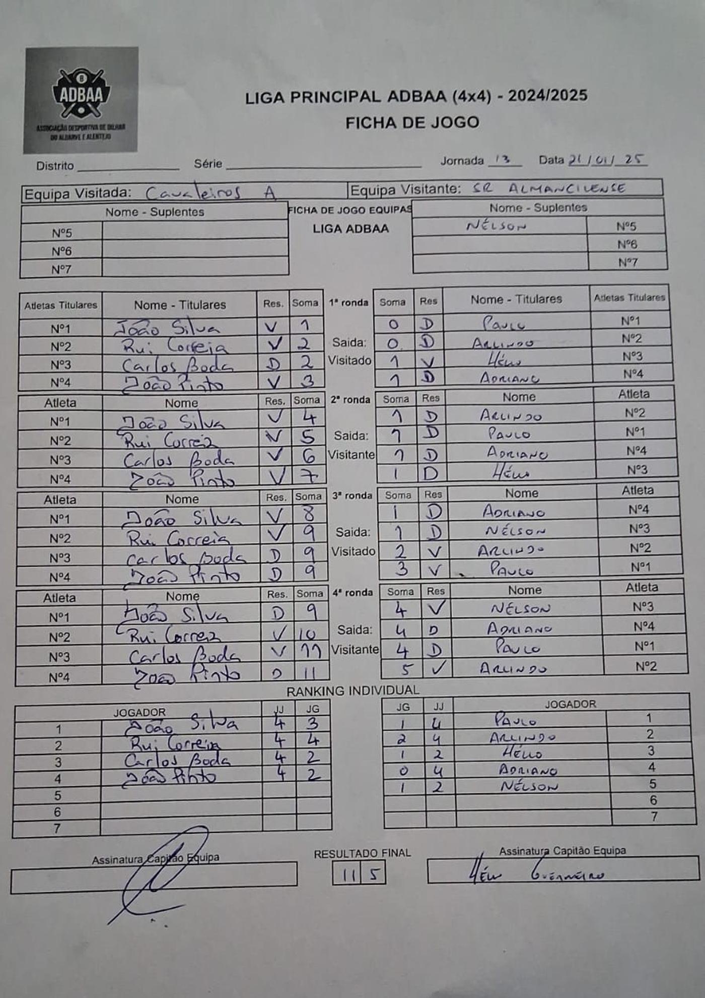 13 | 89 | CONVIVIO DOS CAVALEIROS A | 11-5 | SR ALMANCILENSE | 21/01/2025 | <Sem observações> |