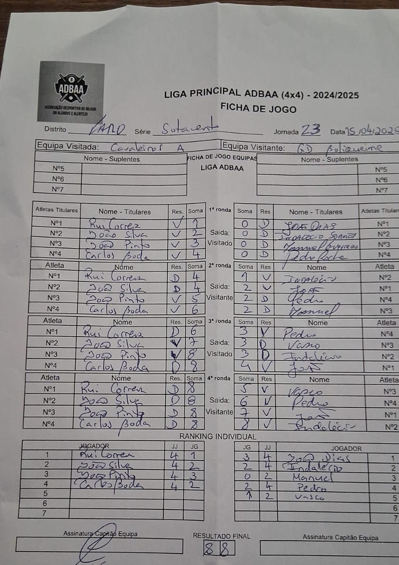 23 | 162 | CONVIVIO DOS CAVALEIROS A | 8-8 | CLUBE DESPORTIVO DE BOLIQUEIME | 15/04/2025 | <Sem observações> |