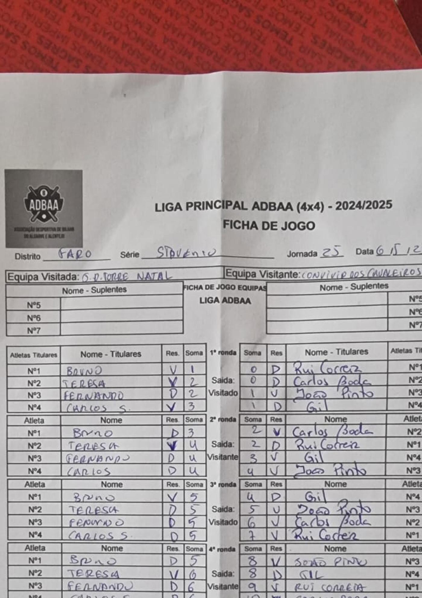 25 | 172 | CONVIVIO DOS CAVALEIROS A | 10-6 | GRUPO DESPORTIVO TORRE NATAL | 06/05/2025 | <Sem observações> |