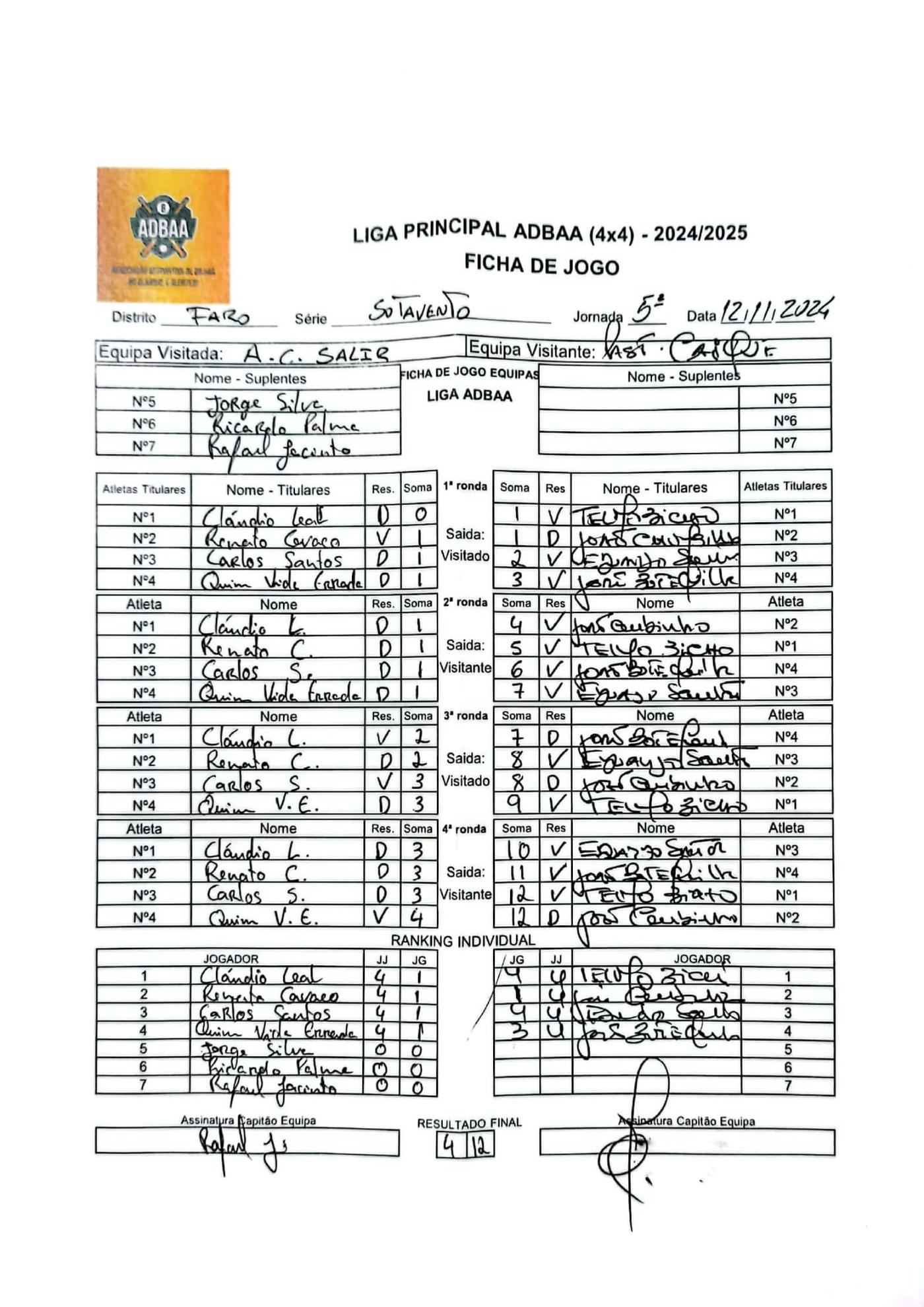 5 | 31 | ASSOCIAÇÃO CULTURAL DE SALIR | 4-12 | PASTELARIA CAIQUE | 12/11/2024 | <Sem observações> |