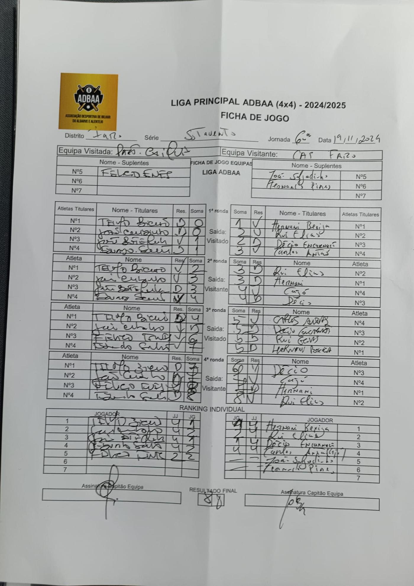 6 | 36 | PASTELARIA CAIQUE | 8-8 | CAP FARO | 19/11/2024 | <Sem observações> |