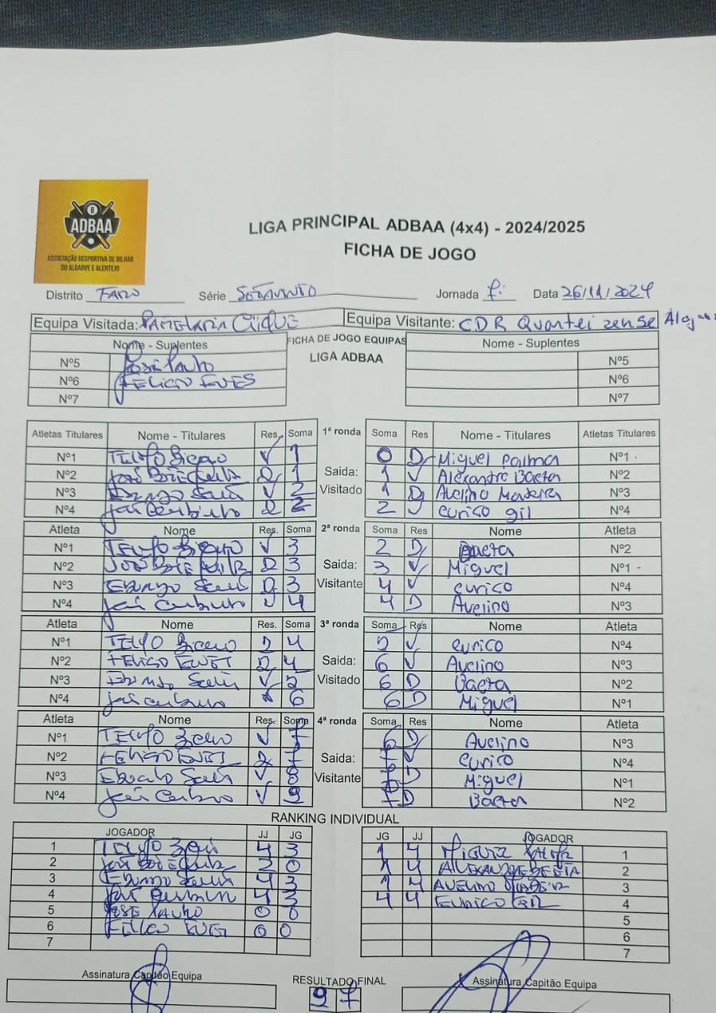 7 | 46 | QUARTEIRENSE SNACK BAR BOLA 8 | 7-9 | PASTELARIA CAIQUE | 26/11/2024 | <Sem observações> |
