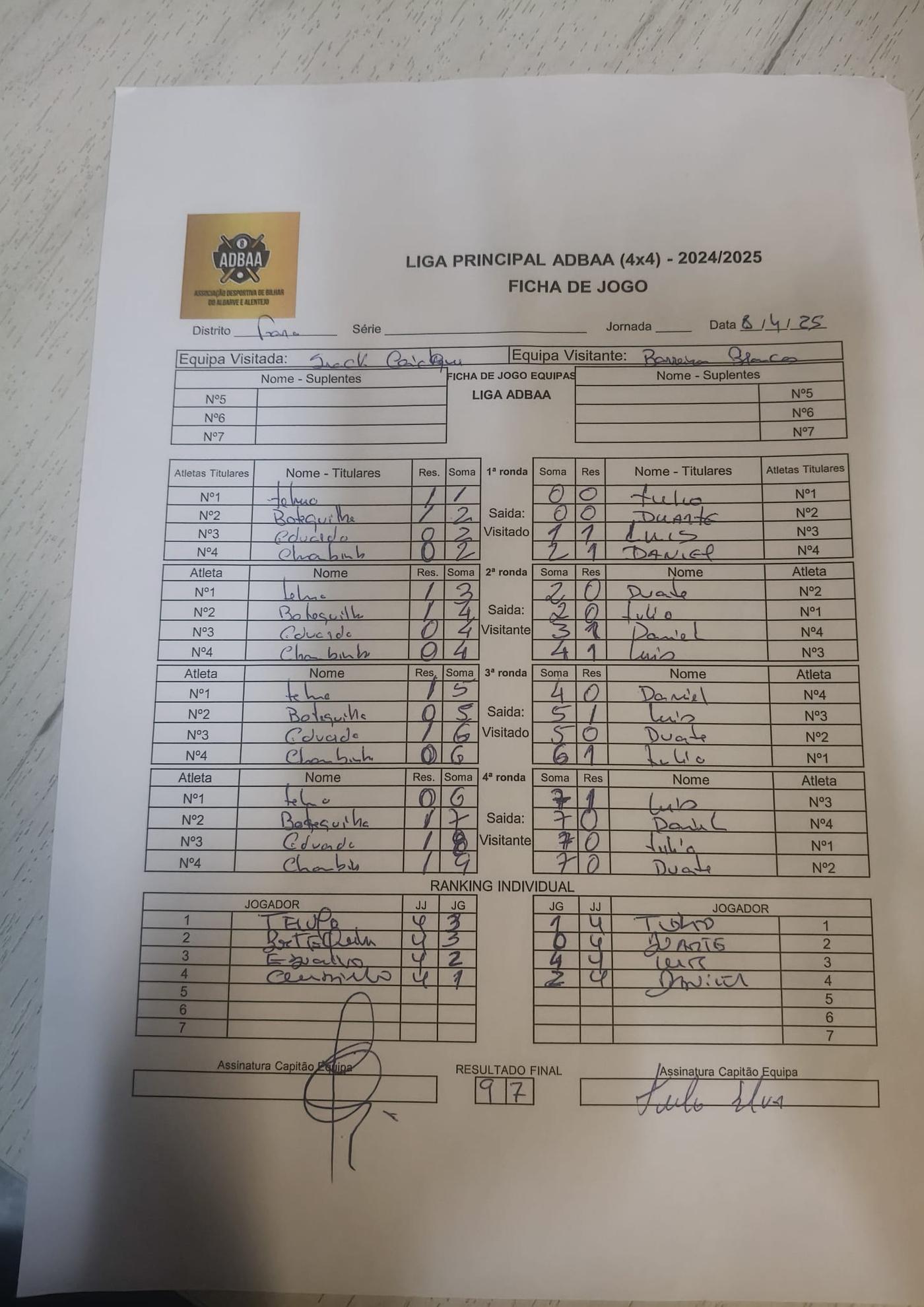 22 | 154 | PASTELARIA CAIQUE | 9-7 | GRUPO DESPORTIVO BARREIRAS BRANCAS | 08/04/2025 | <Sem observações> |