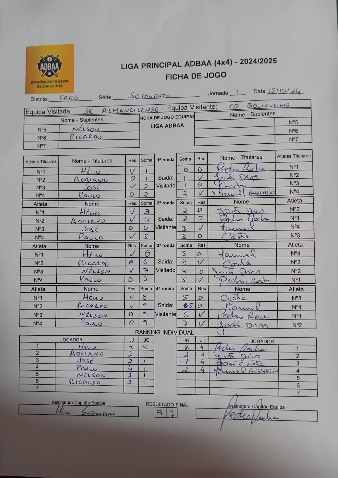 1 | 4 | SR ALMANCILENSE | 9-7 | CLUBE DESPORTIVO DE BOLIQUEIME | 15/10/2024 | <Sem observações> |