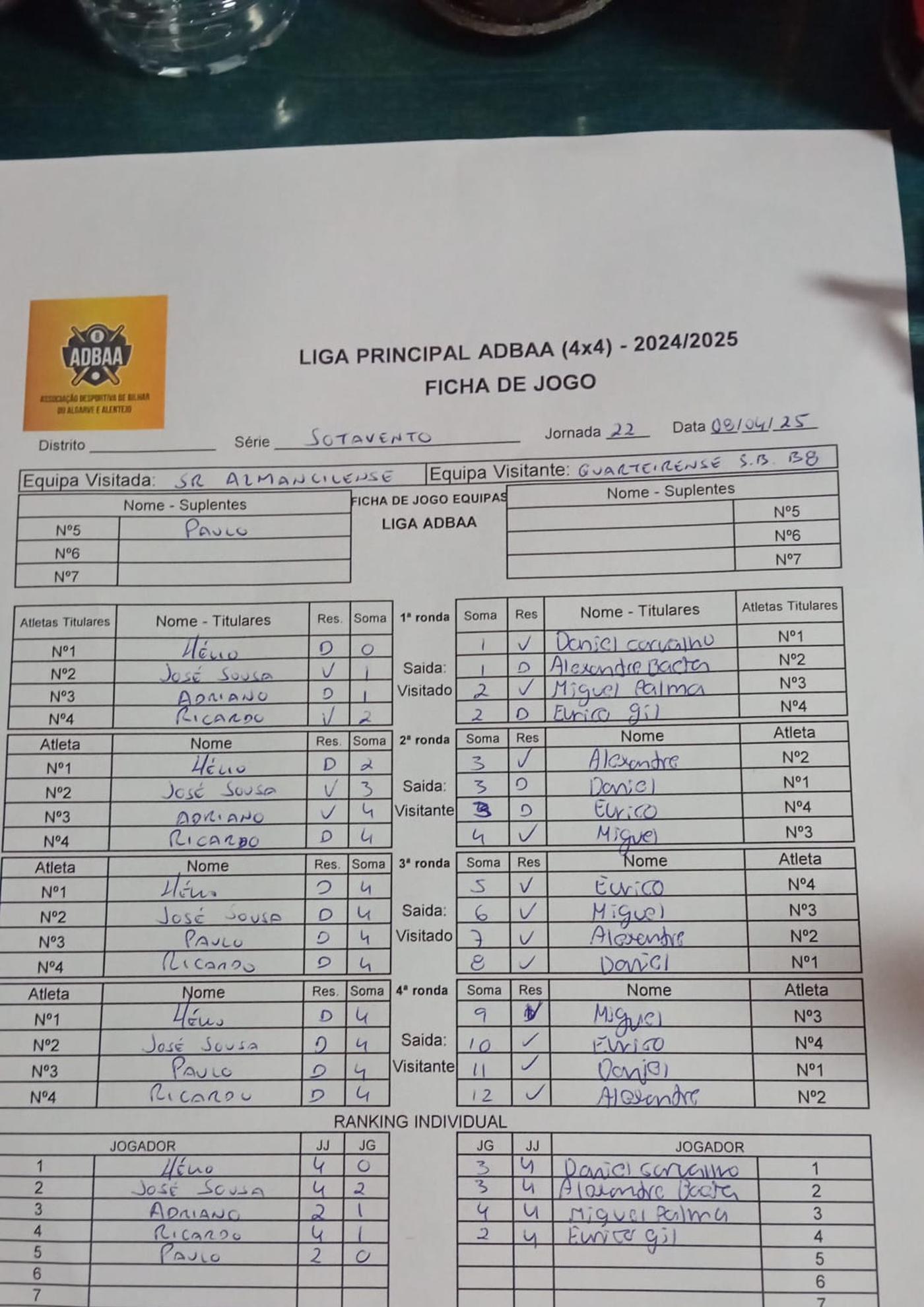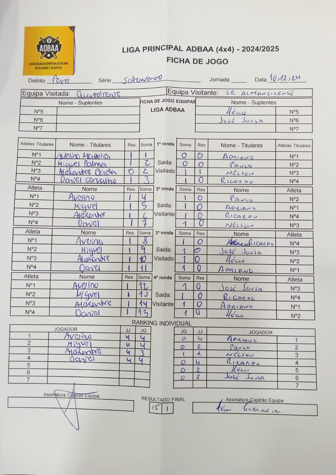 22 | 152 | SR ALMANCILENSE | 4-12 | QUARTEIRENSE SNACK BAR BOLA 8 | 08/04/2025 | <Sem observações> |