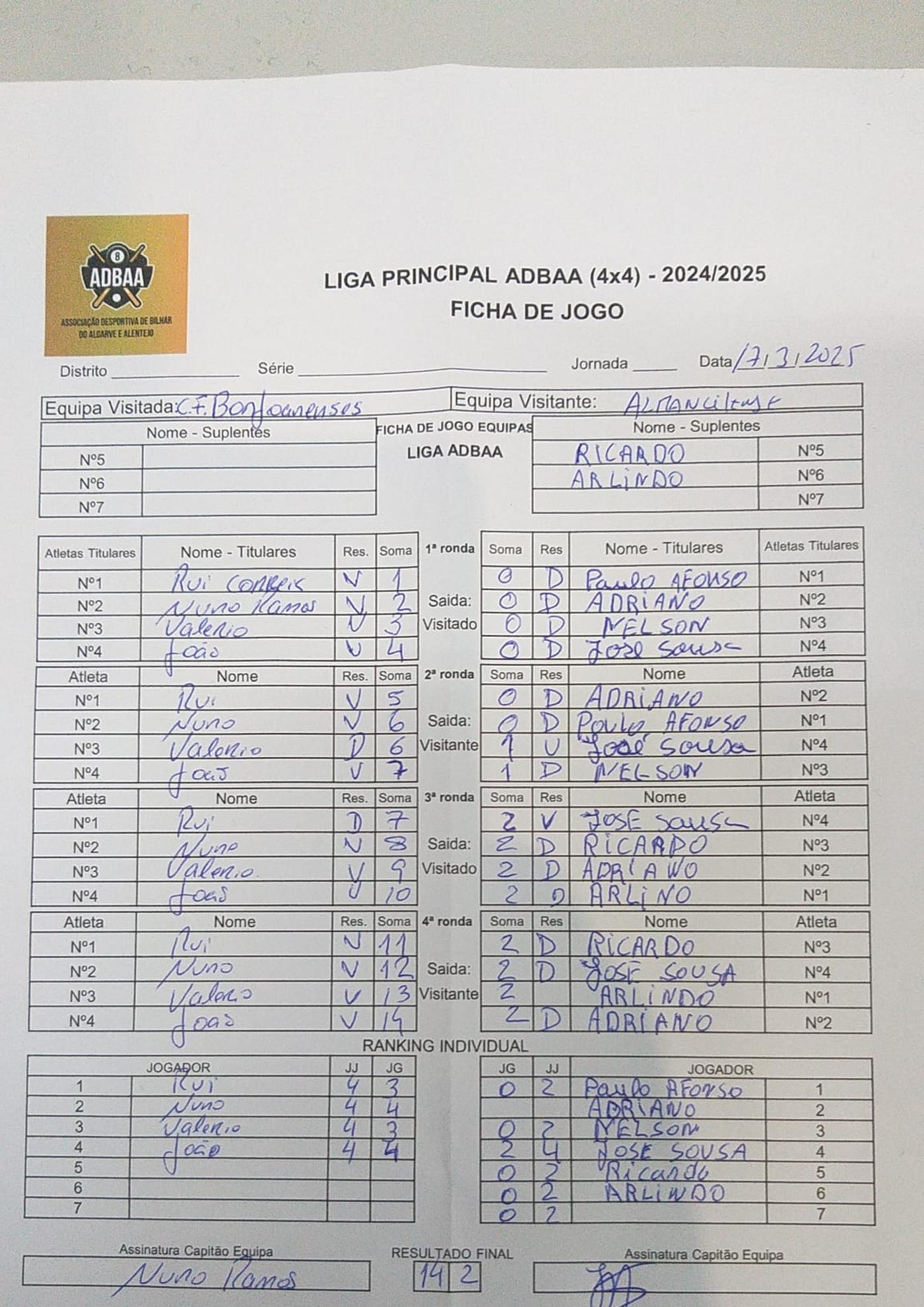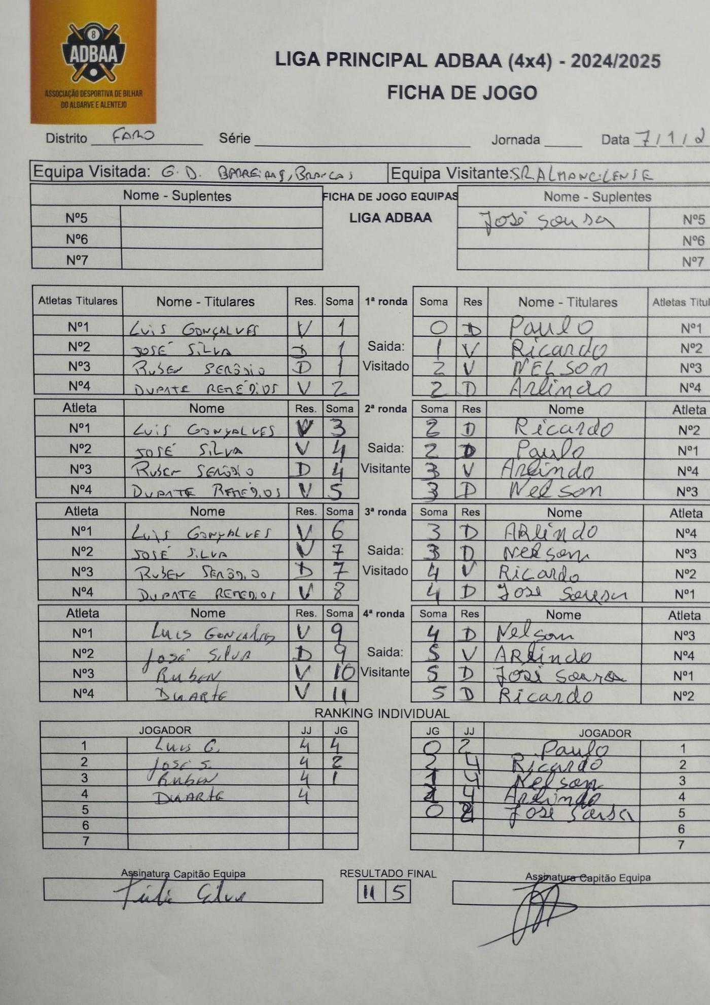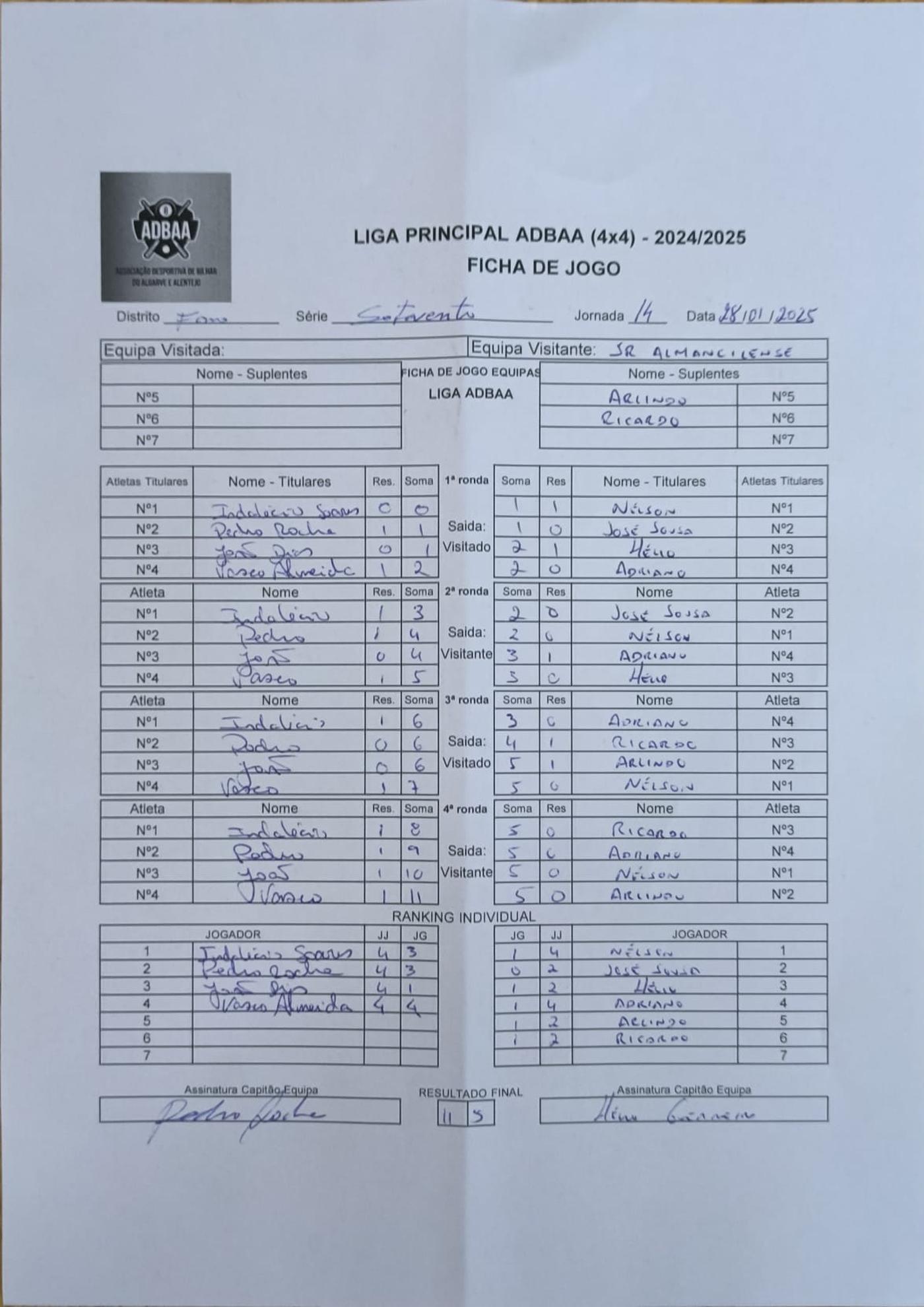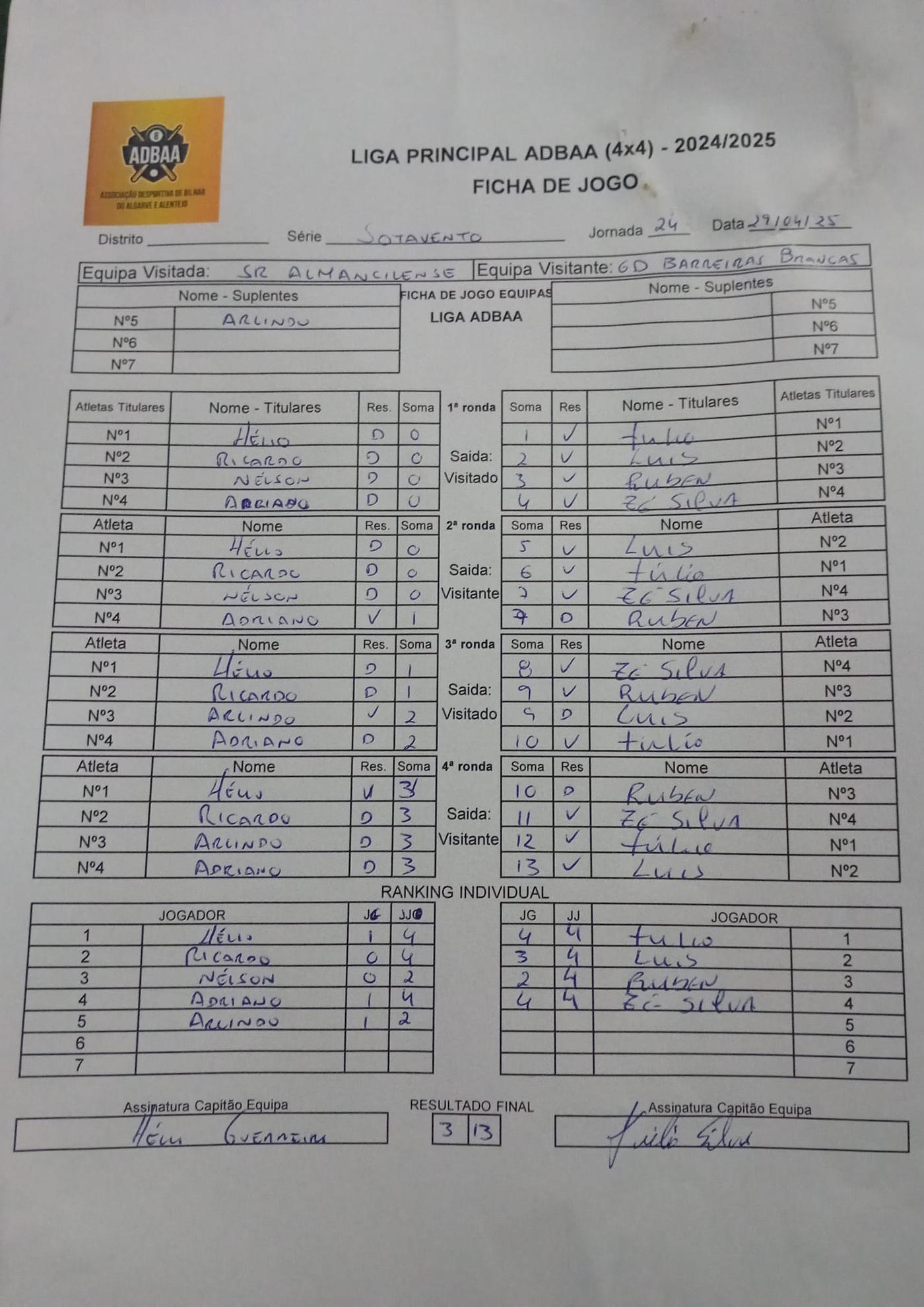 11 | 74 | GRUPO DESPORTIVO BARREIRAS BRANCAS | 11-5 | SR ALMANCILENSE | 07/01/2025 | <Sem observações> |