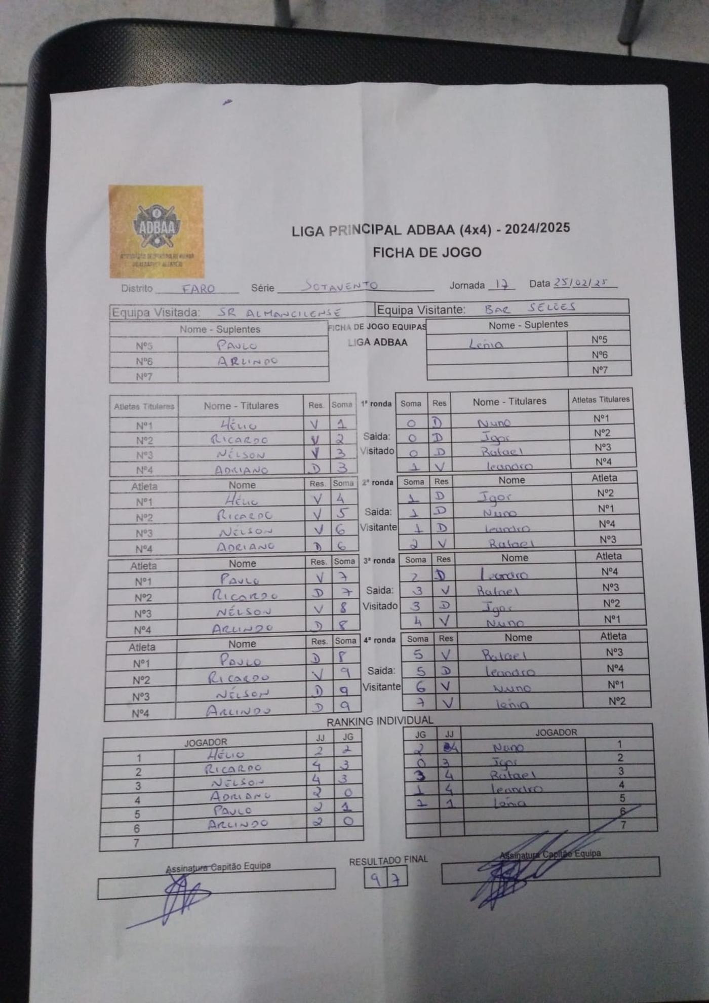17 | 120 | SR ALMANCILENSE | 9-7 | BAR DOS SELÕES | 25/02/2025 | <Sem observações> |