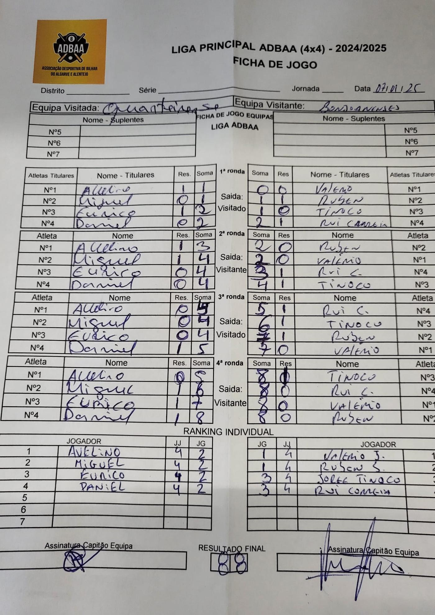 11 | 72 | QUARTEIRENSE SNACK BAR BOLA 8 | 8-8 | CF OS BONJOANENSES | 07/01/2025 | <Sem observações> |