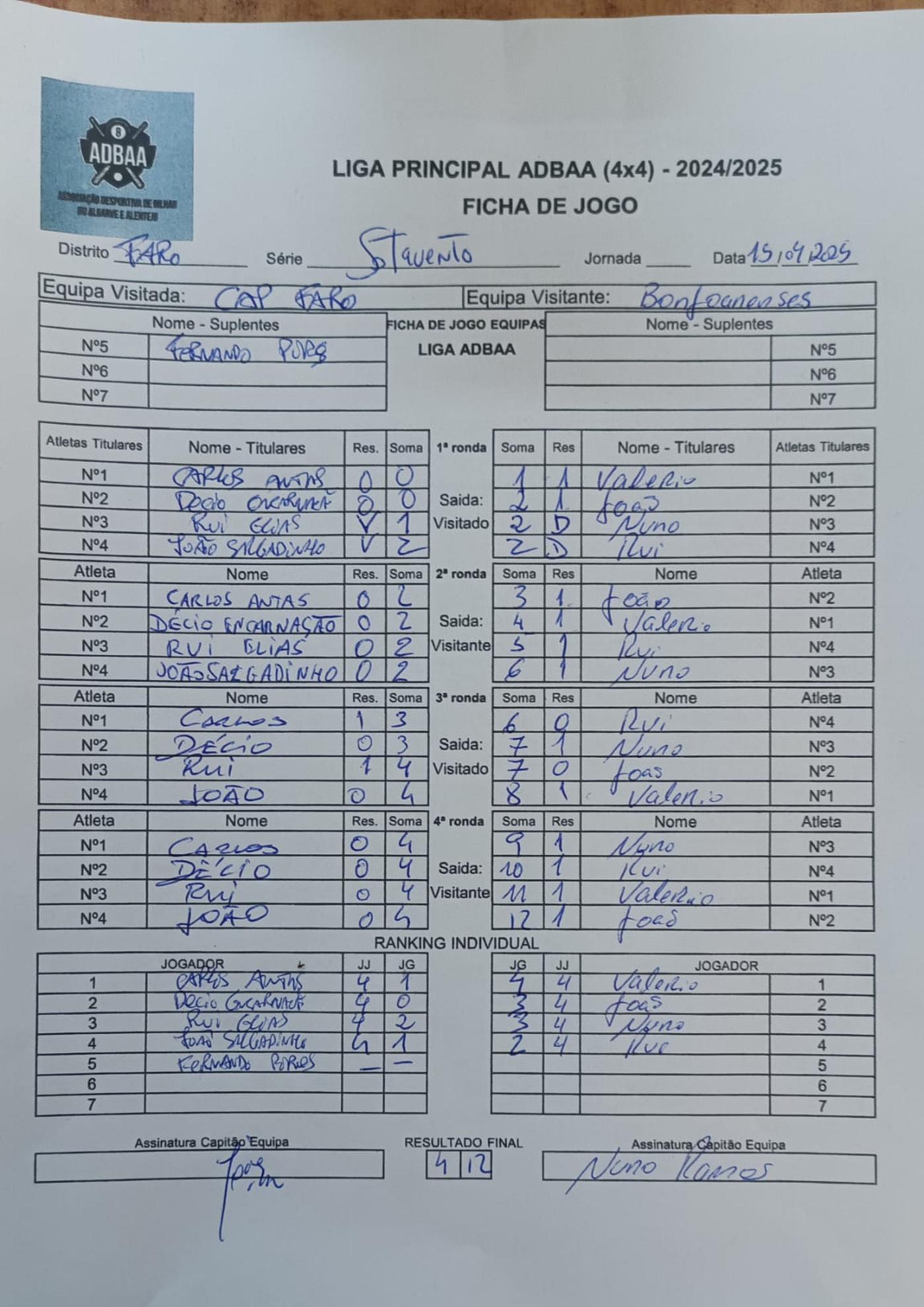 23 | 161 | CAP FARO | 4-12 | CF OS BONJOANENSES | 15/04/2025 | <Sem observações> |