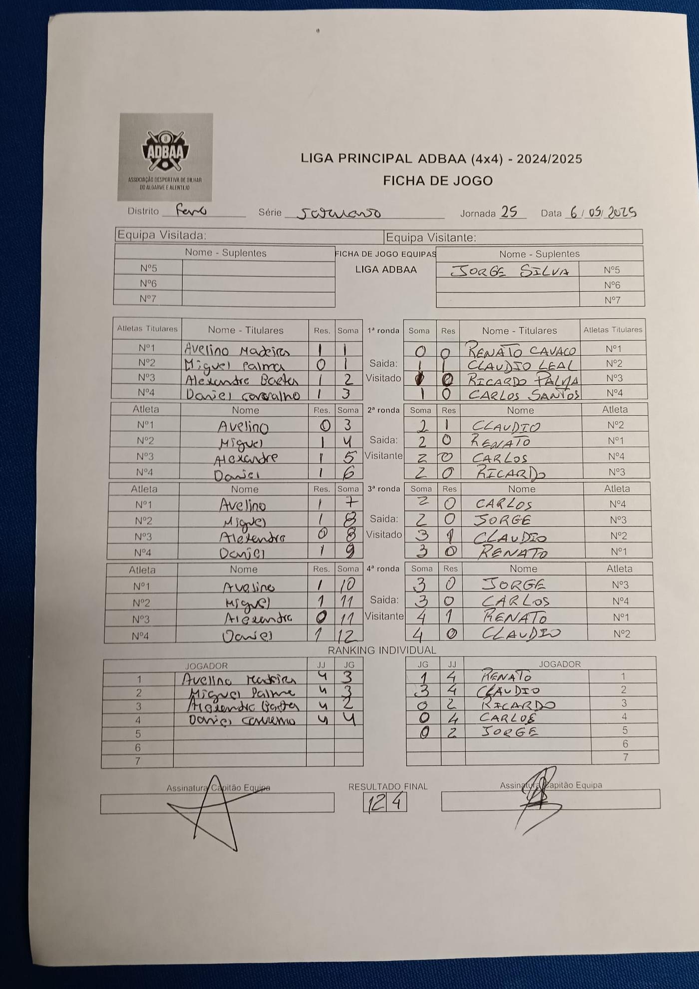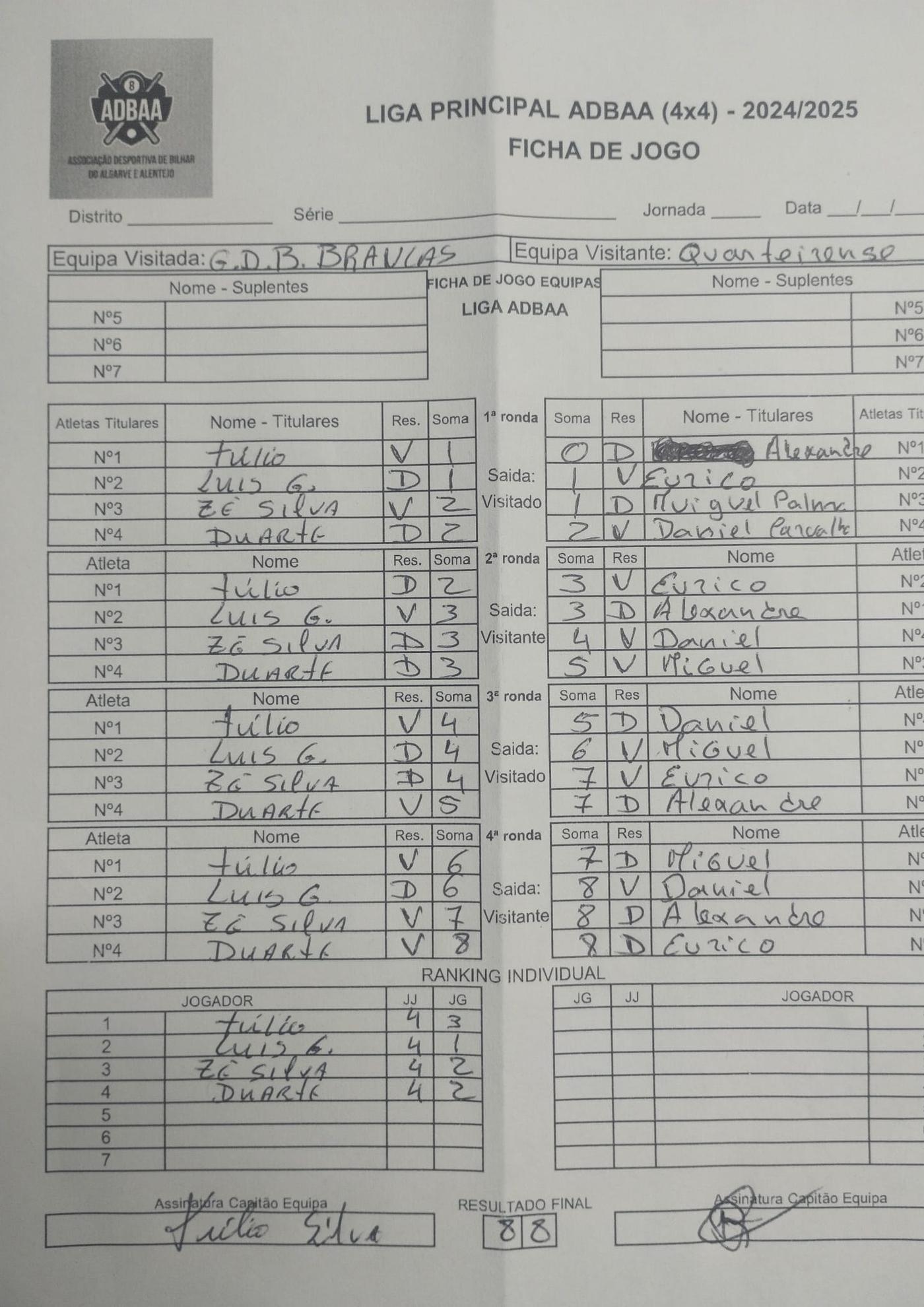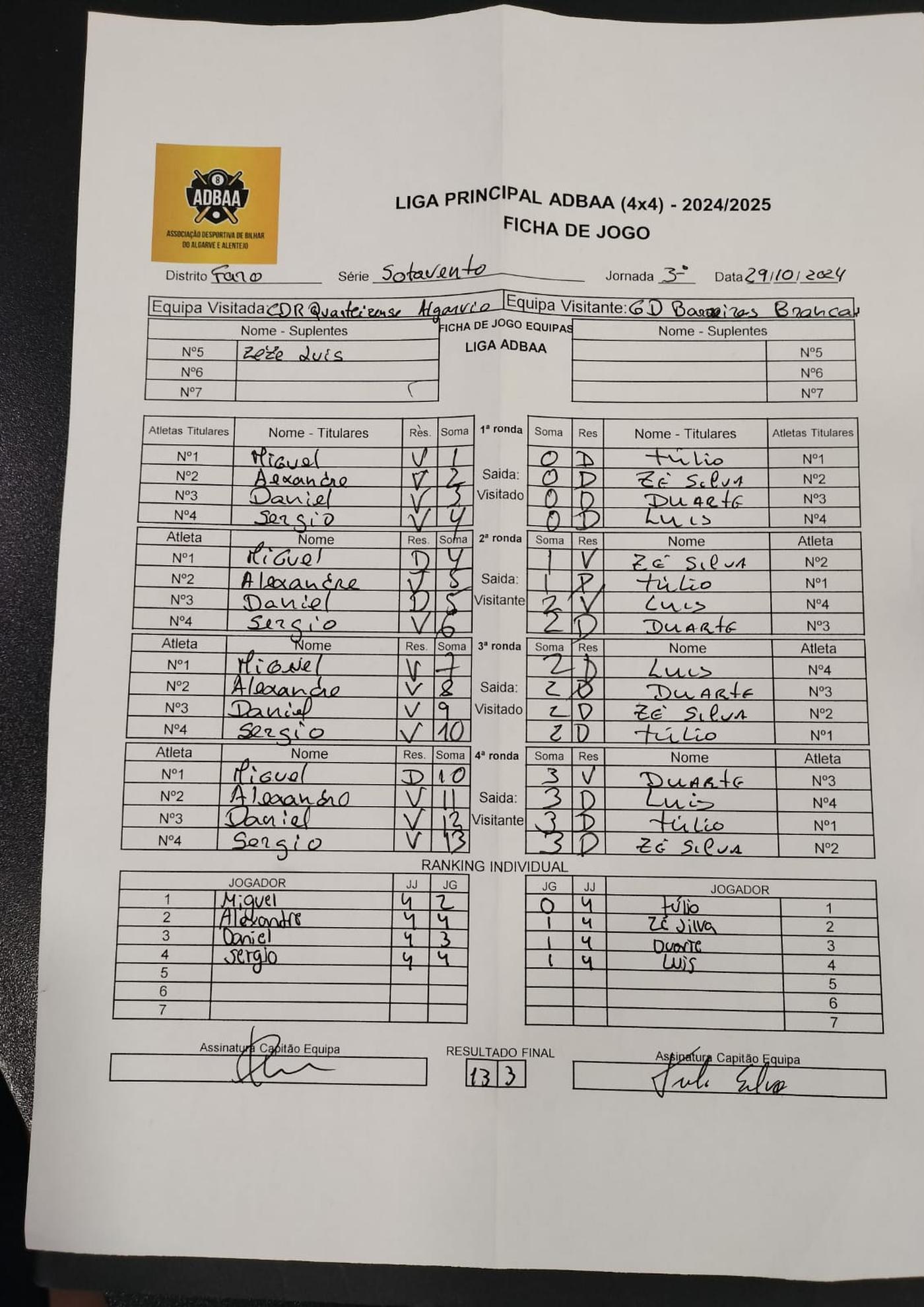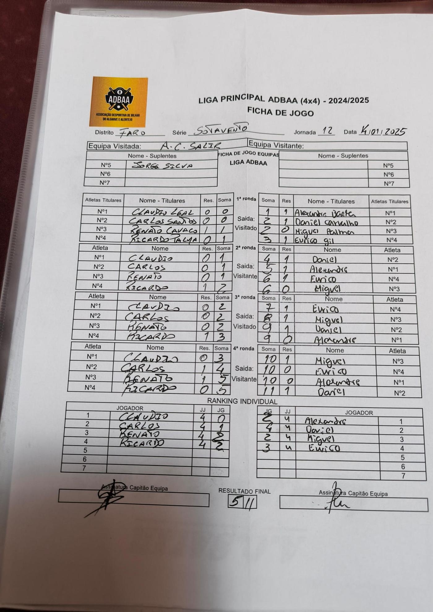14 | 100 | BAR DOS SELÕES | 6-10 | QUARTEIRENSE SNACK BAR BOLA 8 | 28/01/2025 | <Sem observações> |